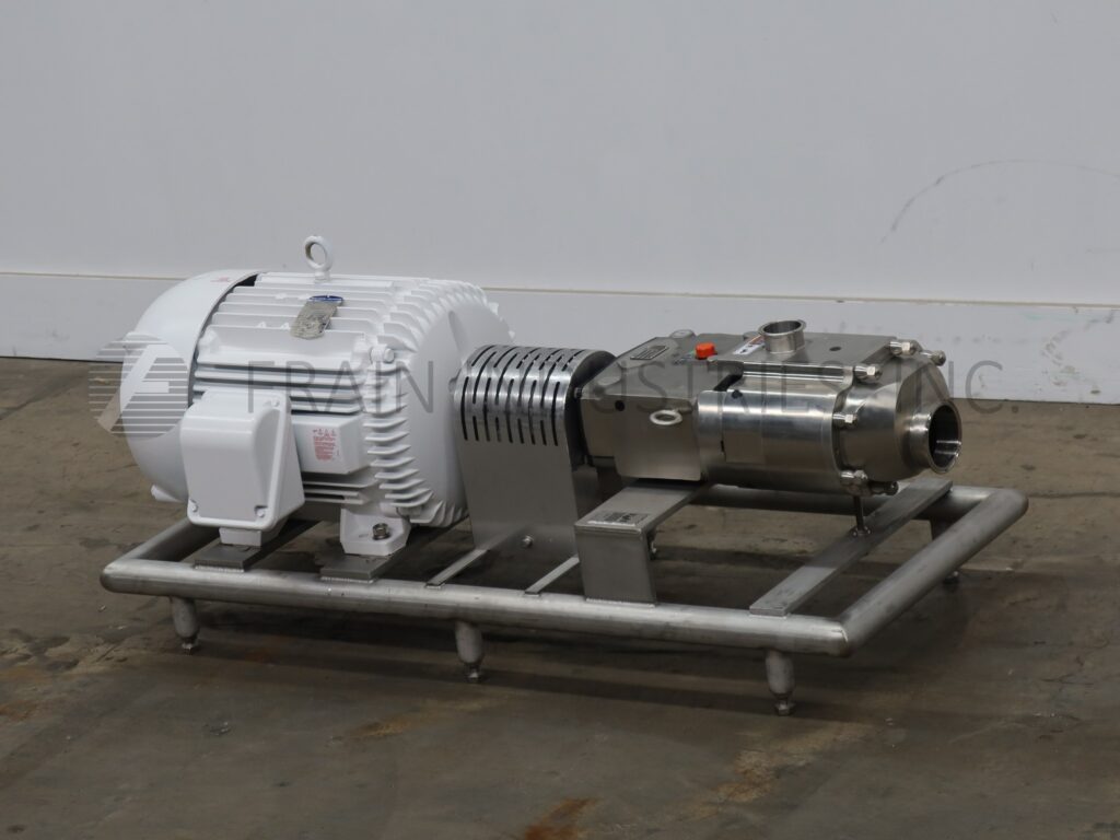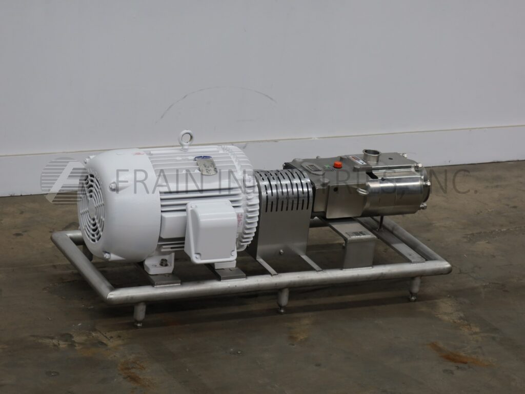 Waukesha, Model 45, positive displacement pump with 316 stainless steel contact parts. Rated from 1 to 58 gallons of product per minute – depending on materials, application and machine configuration. 450 psi maximum working pressure, temperature range of -40 Deg F to 200 deg f standard and up to 300 deg F with hot clearence rotors / stators and viton seals and capable operating both clockwise, or counter clockwise. Equipped with 2½" OD / 2" ID Tri-Clamp style product charge / discharge with 13½" ground clearance. Powered by 3 Hp motor drive with 10.89:1 gear ratio for a current rate of 15.79 gallons per minute.