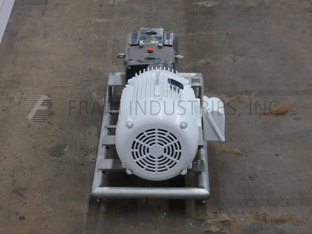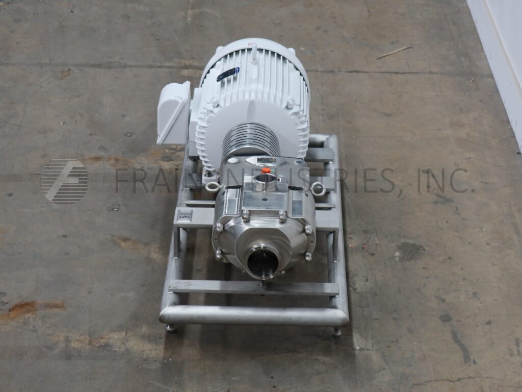 Waukesha, Model 45, positive displacement pump with 316 stainless steel contact parts. Rated from 1 to 58 gallons of product per minute – depending on materials, application and machine configuration. 450 psi maximum working pressure, temperature range of -40 Deg F to 200 deg f standard and up to 300 deg F with hot clearence rotors / stators and viton seals and capable operating both clockwise, or counter clockwise. Equipped with 2½" OD / 2" ID Tri-Clamp style product charge / discharge with 13½" ground clearance. Powered by 3 Hp motor drive with 5.79:1 gear ratio for a current rate of 29.79 gallons per minute.