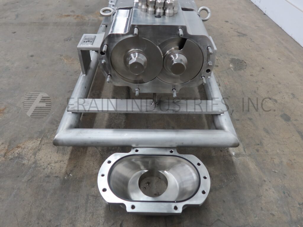 Waukesha, Model 130UTS, positive displacement twin screw pump with 316 stainless steel contact parts. Rated from 1 to 300 gallons of product per minute with current screw pitch and capable of up to 600 gallons per minute – depending on materials, application and machine configuration. 375 psi maximum working pressure, temperature range of -40° F to 300° F. Equipped with 4¾" OD / 4" ID Tri-Clamp style product charge with 11" ground clearance and 3"OD / 2½"ID top discharge with a 20" discharge height. Powered by 15 Hp motor drive for a current rate of 211.2 gallons per minute.