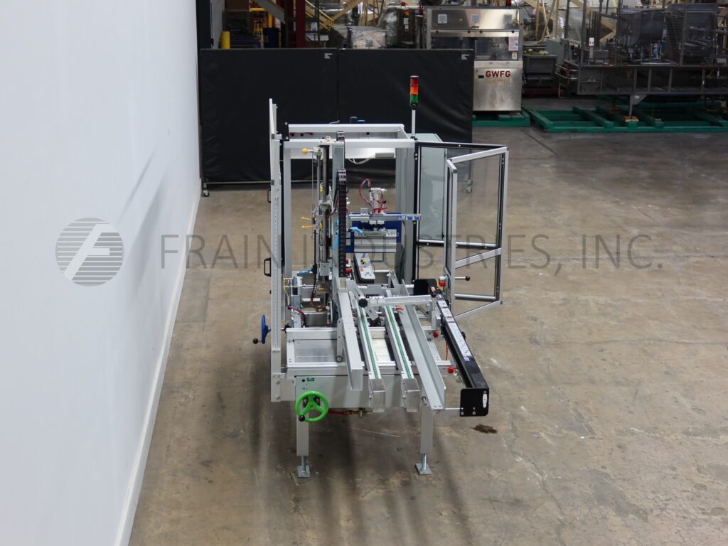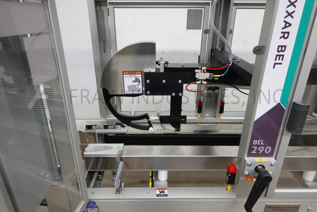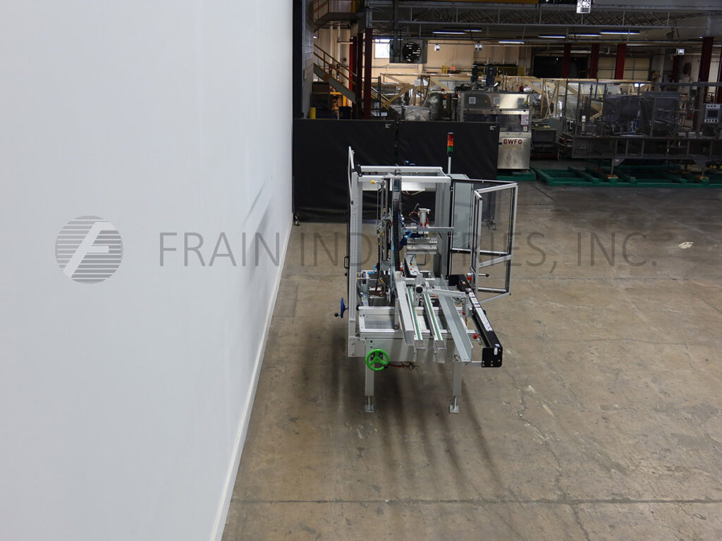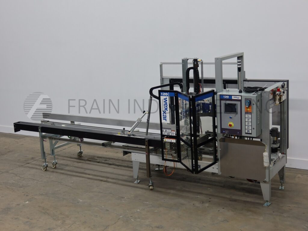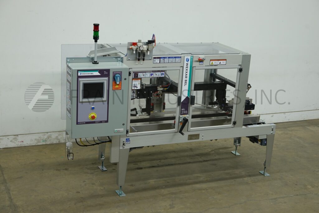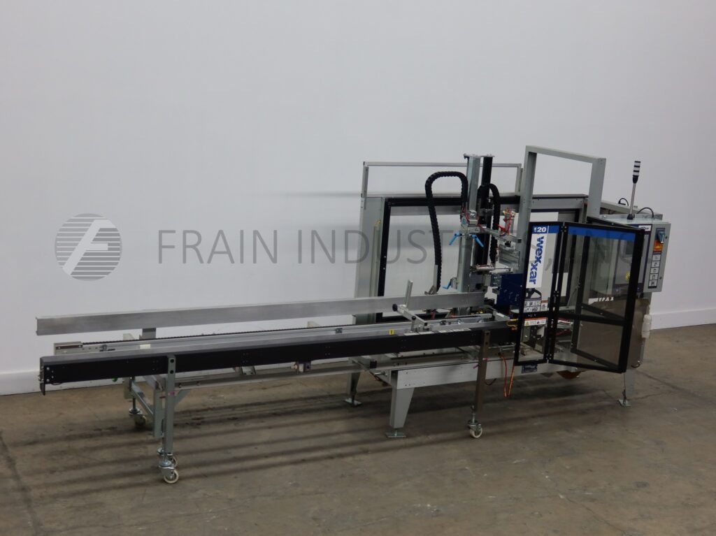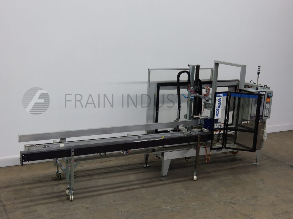 Wexxar, Model WF-20T, Automatic, in line case erector, bottom taper. Rated from 5 to 20 cases per minute – depending on materials, application and machine configuration. Case size range: 7¼" to 18" in Length; 7¼" to 14" in Width; 6" to 15" in Height. Equipped with 64" long blank case magazine, pin and dome case erecting system, minor and major flap closers, 2" bottom tape head, 32" long hand crank adjustable side gripper belts. Control panel with touch screen HMI and start and e-stop push button controls and statis light bar. Mounted on (4) leveling leg frame with slide door safety guarding.