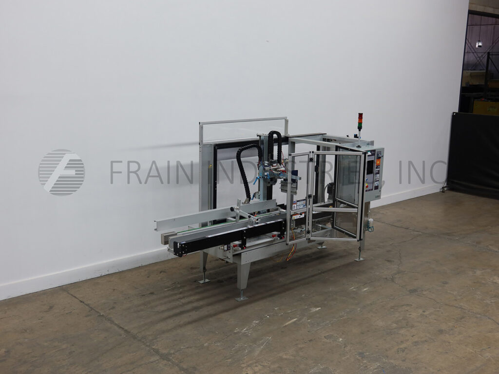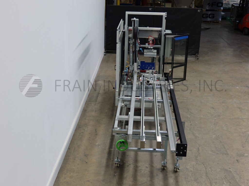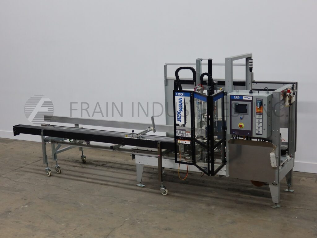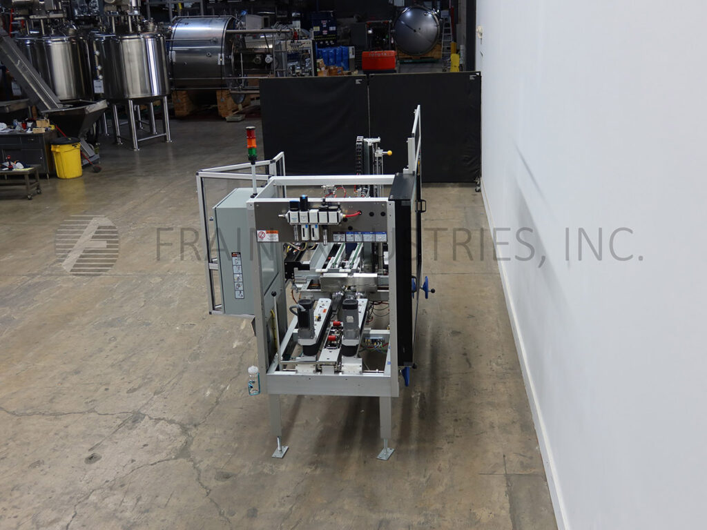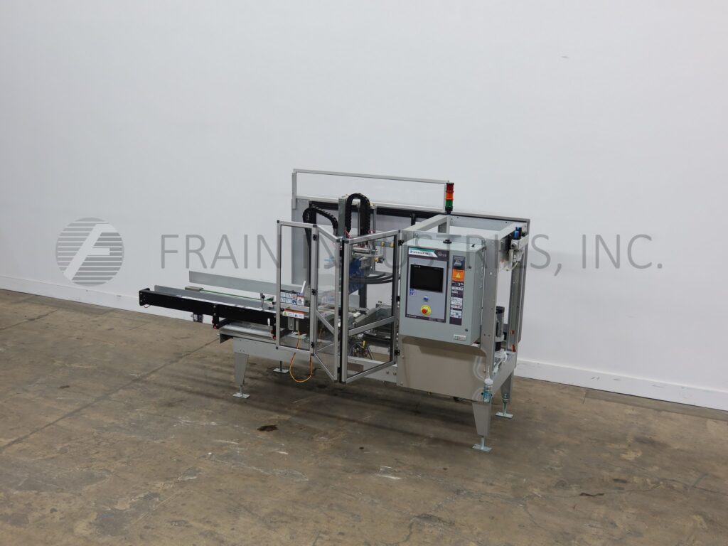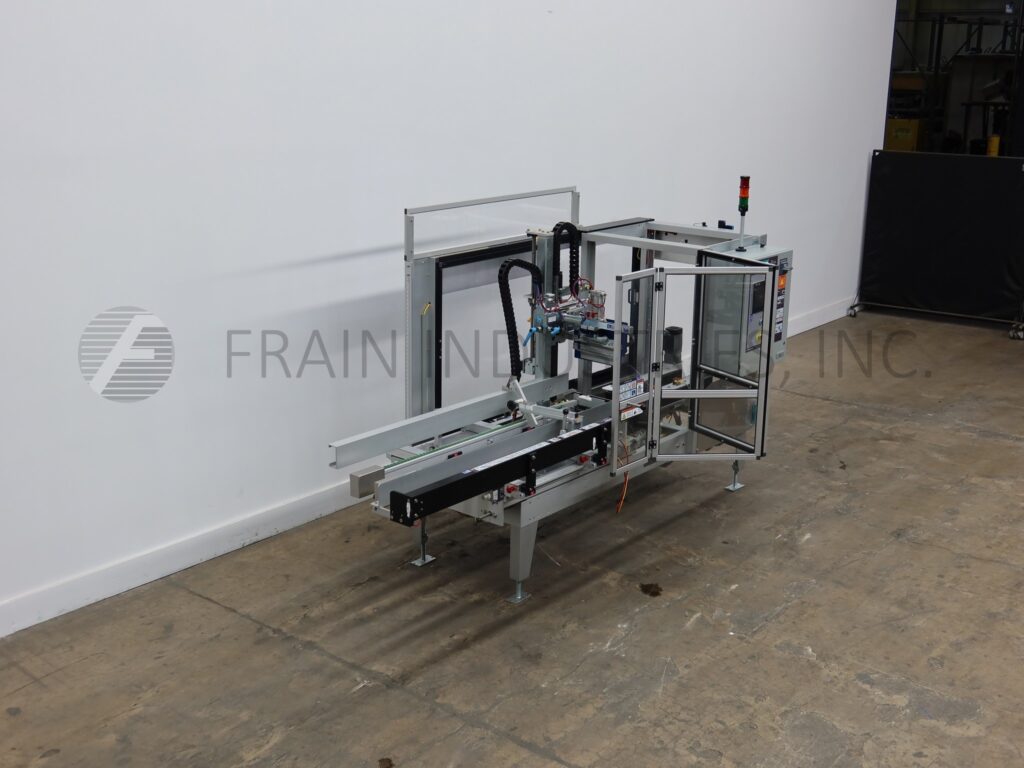 Wexxar, Model WF-20T, Automatic, in line case erector, bottom taper. Rated from 5 to 20 cases per minute – depending on materials, application and machine configuration. Case size range: 7¼" to 18" in Length; 7¼" to 14" in Width; 6" to 15" in Height. Equipped with 64" long blank case magazine, pin and dome case erecting system, minor and major flap closers, 2" bottom tape head, 32" long hand crank adjustable side gripper belts. Control panel with touch screen HMI and start and e-stop push button controls and statis light bar. Mounted on (4) leveling leg frame with slide door safety guarding.