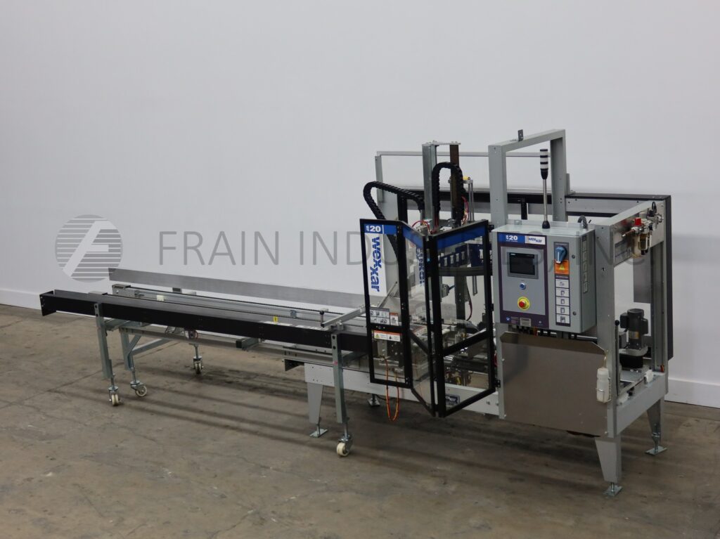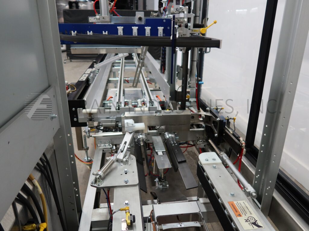 Wexxar, Model WF-20T, Automatic, inline case erector, bottom tape sealer. rated from 5 to 20 cases per minute – depending on materials, application and machine configuration. Blank size range: 11¼" to 38" in length; 10" to 40" in height. Case size range: 6¼" to 24" in Length; 5" to 18" in Width; 6" to 41" in Height (with top open). Equipped with 132" long powered blank case magazine with recipicating pin and dome case forming plates, pneumatic case squareing device, minor and major flap closers, case pusher bar and 6" Dekka flip up tape head with 32" long dual side belt discharge section and is hand crank height and width adjustable with Siko gages. Control panel has an AB controller touch screen HMI.