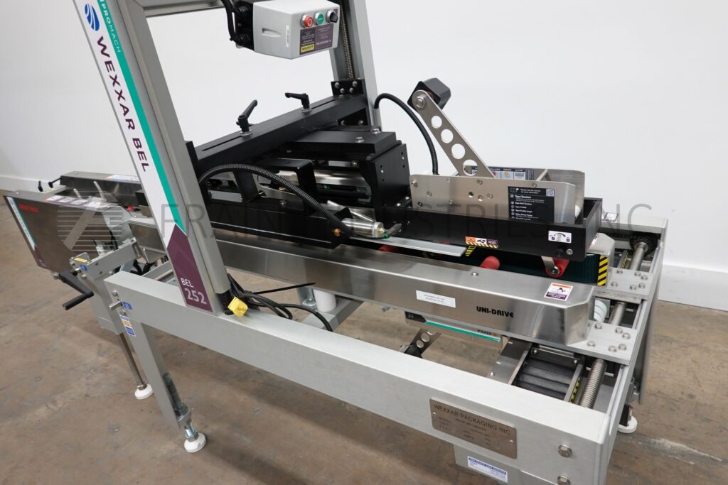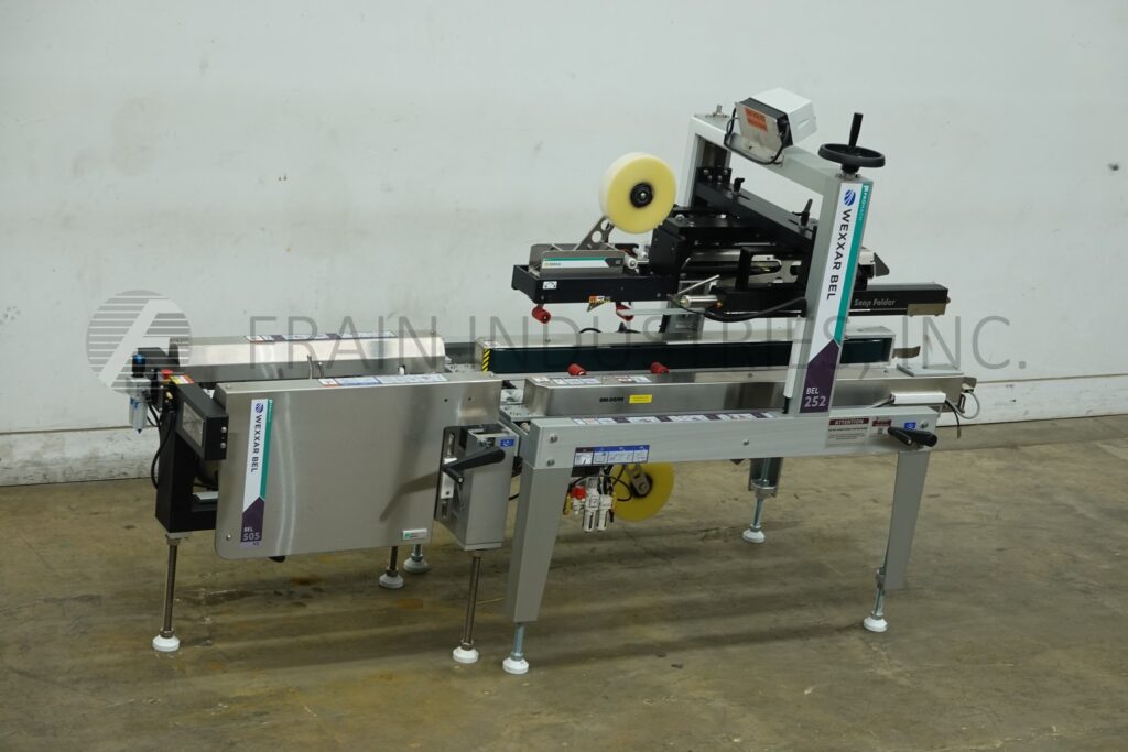Wexxar / Belcor, Model 505 / 252, Uniform, semi automatic case erector with pack station, top and bottom case taper rated from 5 to 25 cases per minute – depending on materials, application and operator dexterity. Case size range: 8" to 22" in Length; 6" to 15½" in Width; 5" to 15¾" in Height. Equipped with Belcor Model 505 manual case erector top case packer and Model 252 top and bottom case taper with side snap flap folders, 58" long x 3" wide side case transfer belts, top and bottom 3" tape heads, hand crank height and width adjustable. Control panel with start, stop, e-stop push button controls. Mounted on (4) leg height adjustable frame.