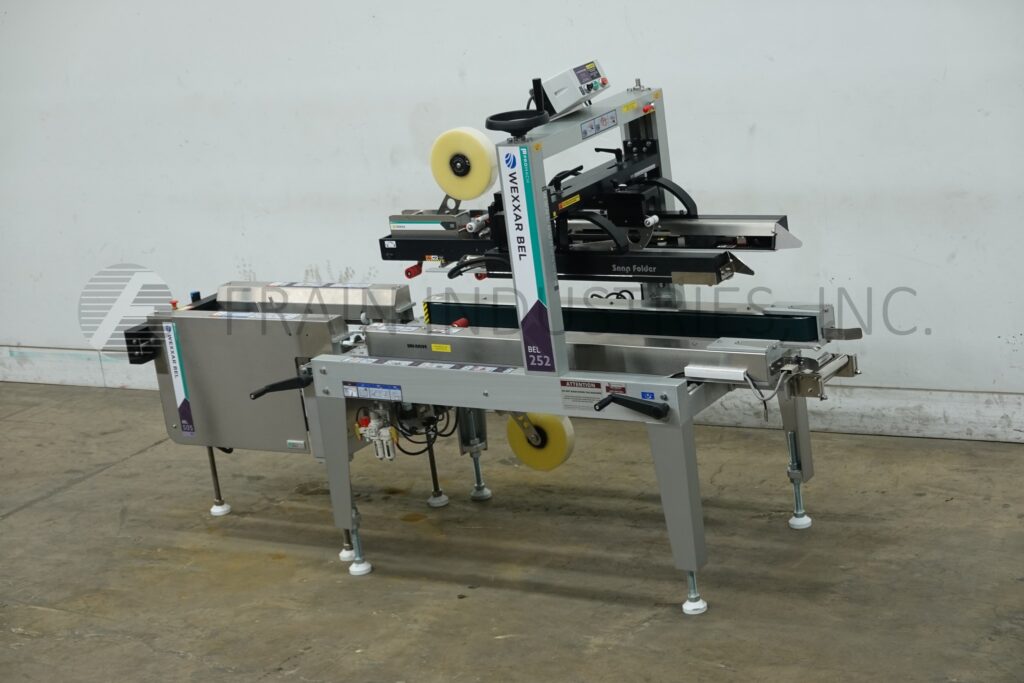Wexxar / Belcor, Model 505 / 252, Uniform, semi automatic case erector with pack station, top and bottom case taper rated from 5 to 25 cases per minute – depending on materials, application and operator dexterity. Case size range: 8" to 22" in Length; 6" to 15½" in Width; 5" to 15¾" in Height. Equipped with Belcor Model 505 manual case erector top case packer and Model 252 top and bottom case taper with side snap flap folders, 58" long x 3" wide side case transfer belts, top and bottom 2" tape heads, hand crank height and width adjustable. Control panel with start, stop, e-stop push button controls. Mounted on (4) leg height adjustable frame.