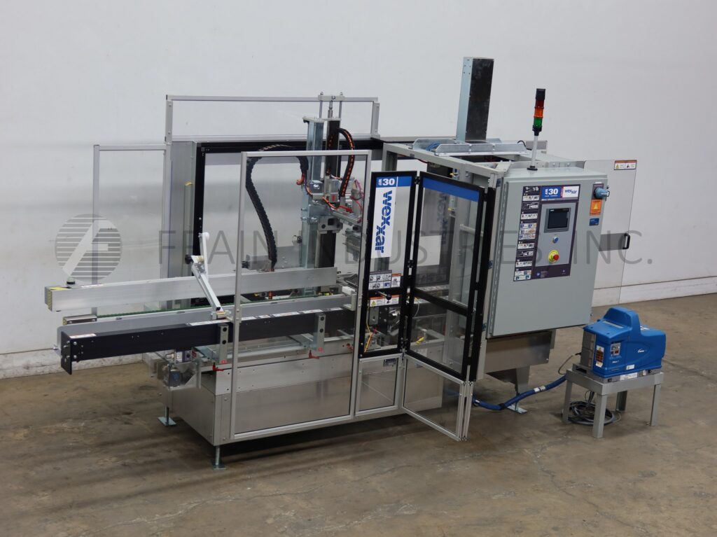 Wexxar, Model WF-30H, Automatic, in line case erector, bottom hot melt glue sealer. Rated from 5 to 30 cases per minute – depending on materials, application and machine configuration. Case size range: 9" to 18" in Length; 5½" to 14" in Width; 6" to 15" in Height. Equipped with 62" long (2) belt powered blank case magazine, pin and dome case forming plates, minor and major flap closers, case pusher bar, Norden ProBlue hot melt glue unit, servo driven auto size adjustment for quick changeovers and 32" long x 3" wide dual side belt discharge section with adjustable from 23" to 28" discharge heights. Control panel has PLC controller with panel view touch screen HMI, e-stop and status light bar. Mounted on base frame with leveling legs and safety guarding.