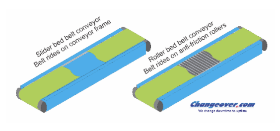 Belt conveyors used in packaging generally come in two types: Slider bed and roller bed. The belt rides directly on the conveyor frame in a slider bed design. A plastic liner may be used between frame and belt to reduce friction. Slider bed conveyors are simple and work well where belt speeds and loads are not high.