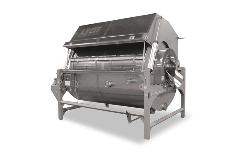 For liquid blanching the cylinder is partially submerged in water. Spray jets for more vigorous washing may also be used. For steam or hot air blanching, jets inside and outside the cylinder do the cooking or blanching. This cooking section takes up the first portion of the cylinder.
