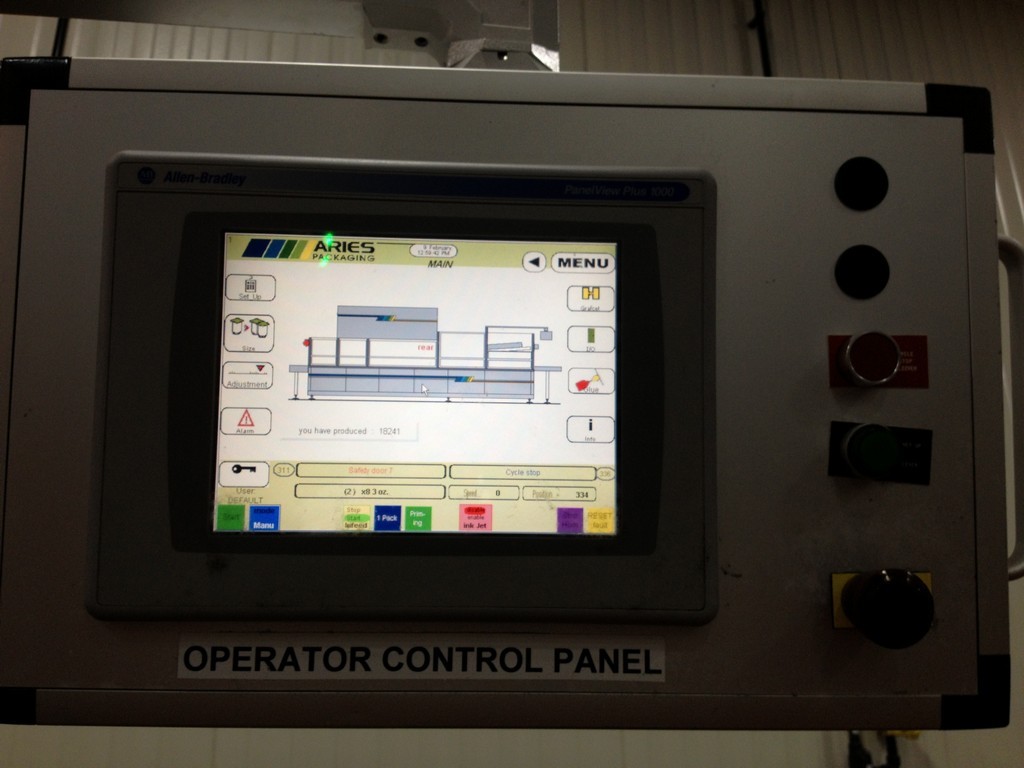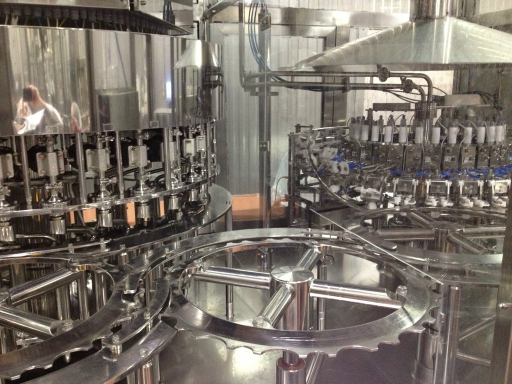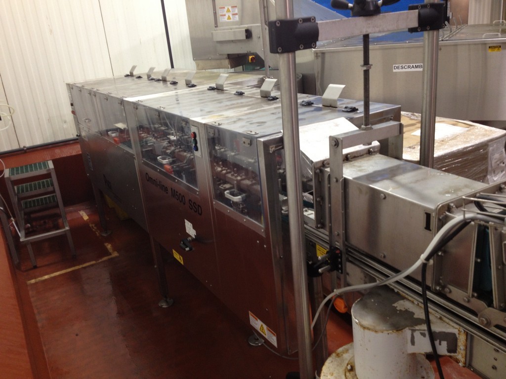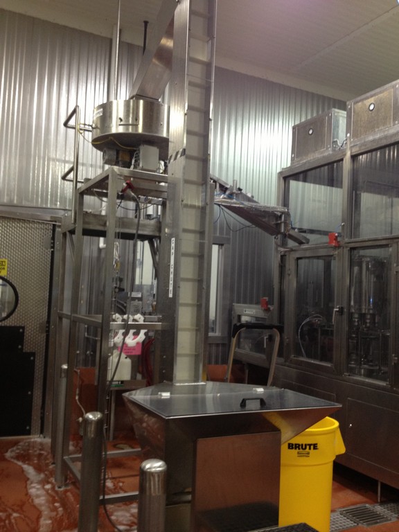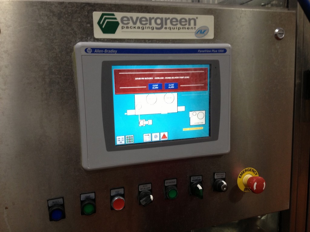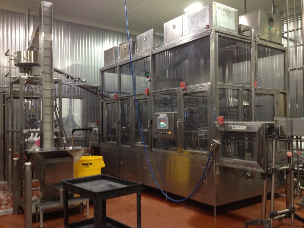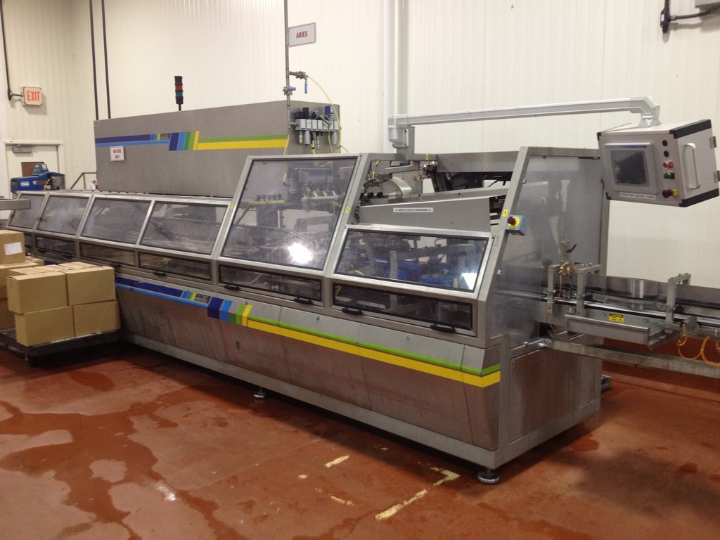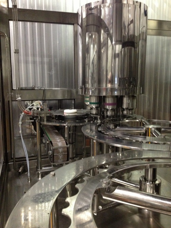 Complete stainless steel liquid bottling line includes bottle sorting to wrap around cartoning and everything in between. A pace bottle elevator and sorter feed the Evergreen monoblock 32-head sanitizing rinser, 32-head filler and 8-head rotary chuck capper with cap sanitizer and cap feeder. Bottles are filled in a chamber flooded with class 100 HEPA air then run through a Tatone x-ray level inspection unit. Filled bottles are packaged with an Aries wrap around hot glue cartoner.