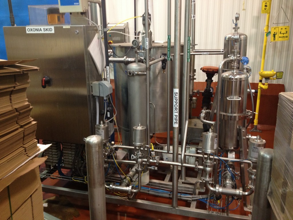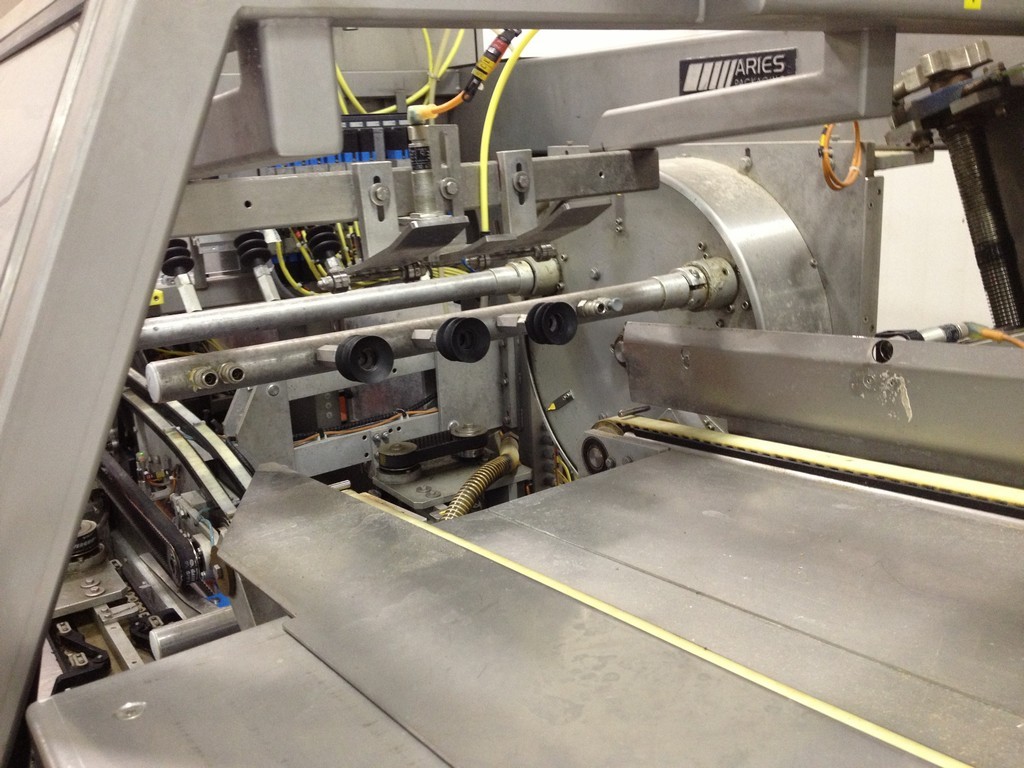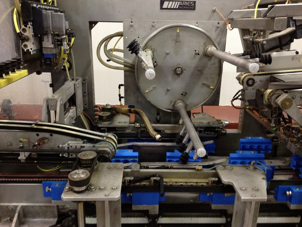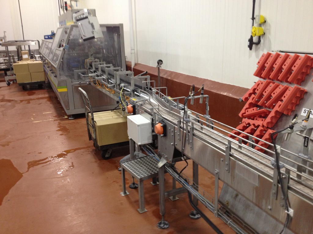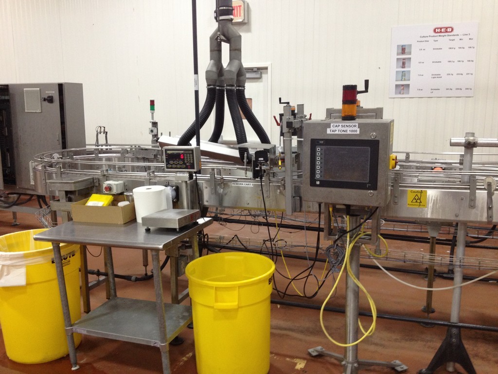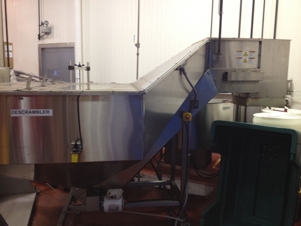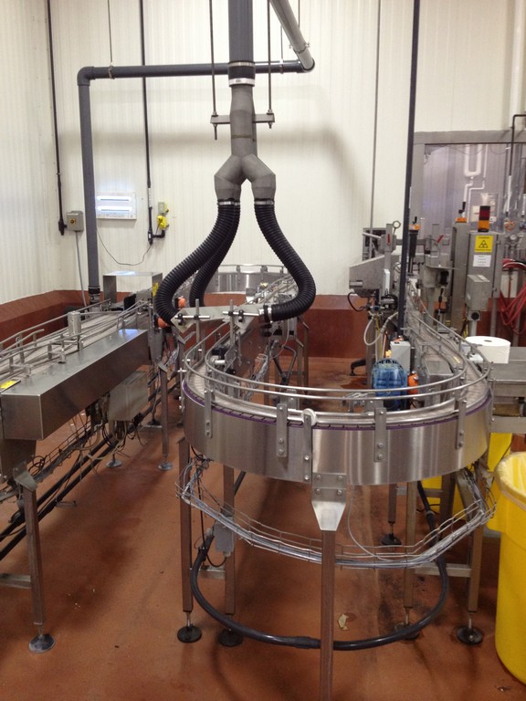 Complete stainless steel liquid bottling line includes bottle sorting to wrap around cartoning and everything in between. A pace bottle elevator and sorter feed the Evergreen monoblock 32-head sanitizing rinser, 32-head filler and 8-head rotary chuck capper with cap sanitizer and cap feeder. Bottles are filled in a chamber flooded with class 100 HEPA air then run through a Tatone x-ray level inspection unit. Filled bottles are packaged with an Aries wrap around hot glue cartoner.