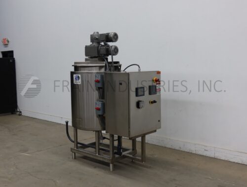 Back to All EquipmentA&B Process systems, model 100 Gallon, 316 stainless steel, double motion, jacketed processor tank. Vessle Dimensions: 30" ID x 40" deep with a 64½" infeed height. Equipped with bridge mounted double motion scrape and paddle agitator, scrapers powered by a 1 HP drive and paddles powered by a 1 HP drive, lift up manway, 1" tri-clamp style discharge with butterfly valve and 18½" ground clearance. Control panel with AB PLC and touchscreen HMI.
