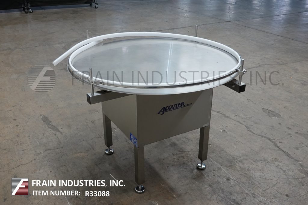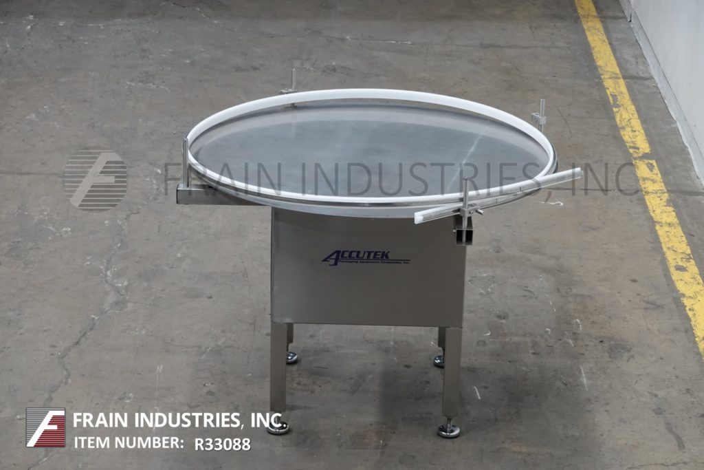 Back to All EquipmentAccutek, 48"diameter, stainless steel, rotary disc accumulator with number of containers per minute – depending on materials, application and machine configuration. Equipped with stainless steel 48" disc with variable speed dial, adjustable side rails and a table height of 32" to 35".