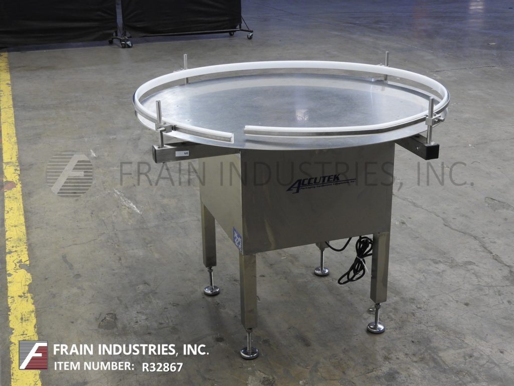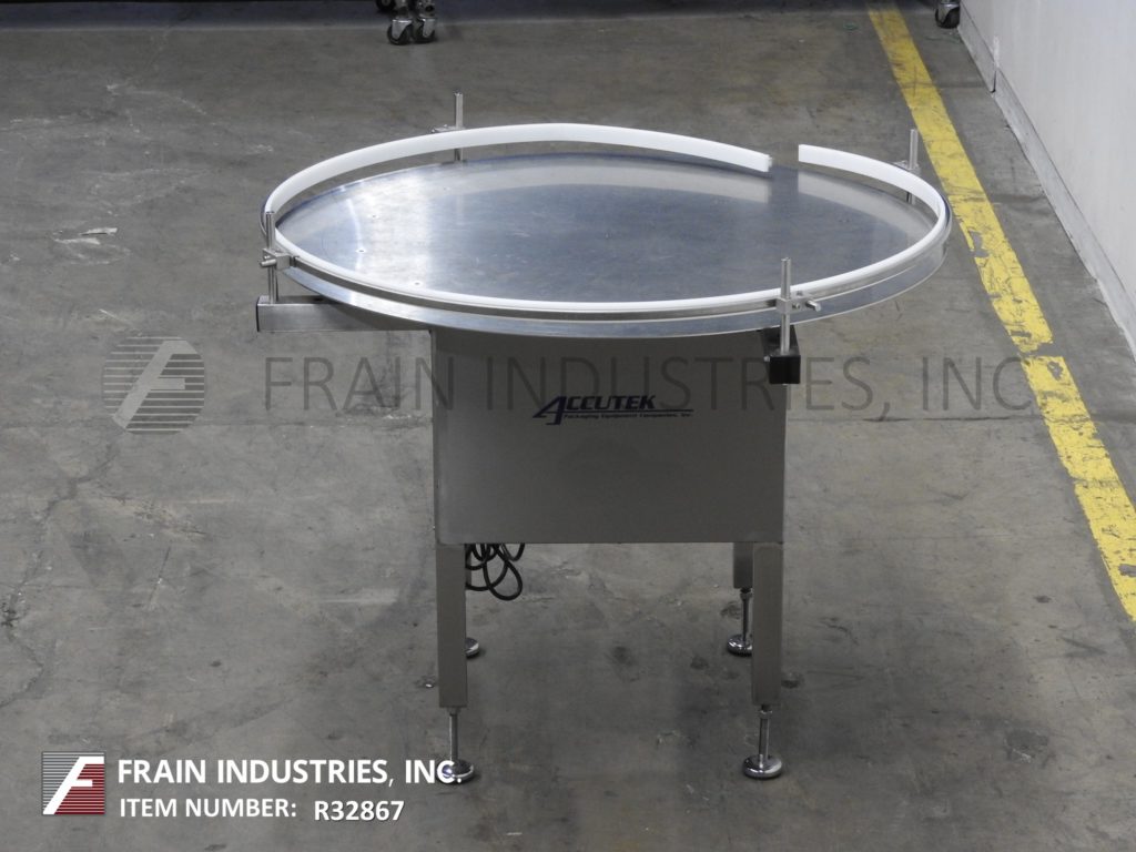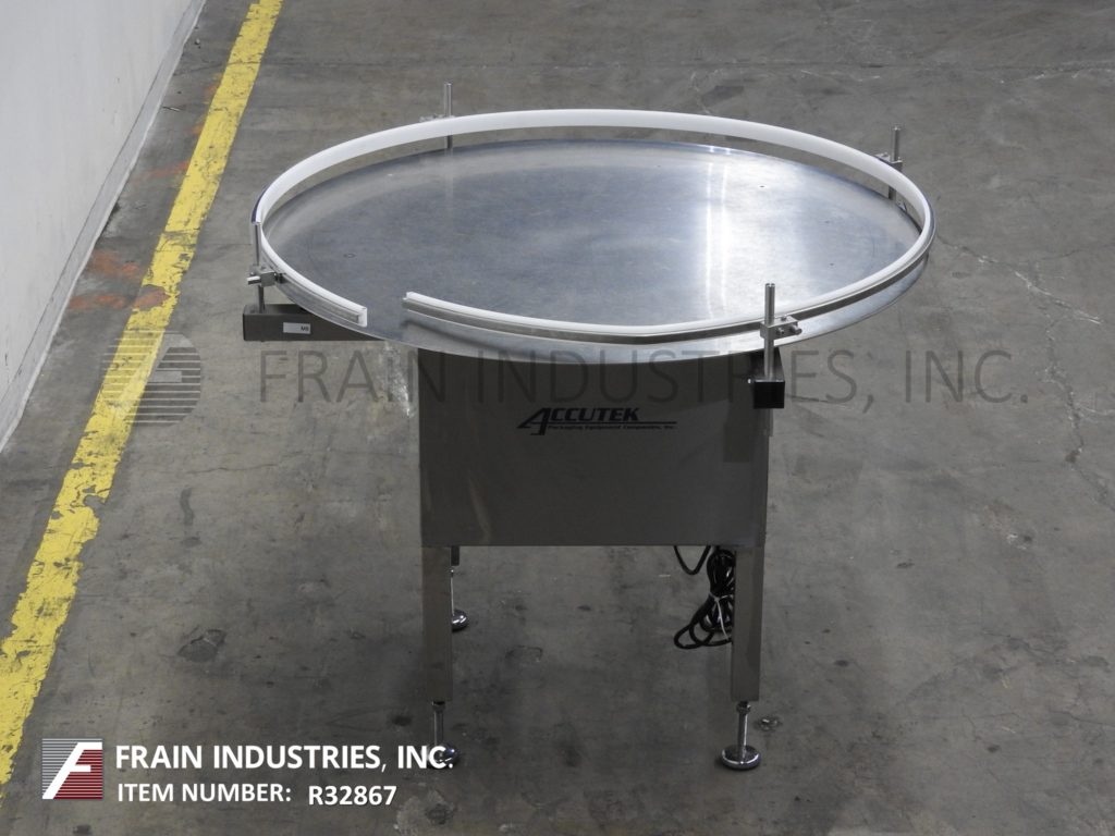 Back to All EquipmentAccutek, 48" OD, stainless steel, rotary disc unscrambler with number of containers per minute – depending on materials, application and machine configuration. Equipped with stainless steel 48" OD disc with variable speed dial, adjustable side rails and table height of 32" to 35". Mounted on (4) leg stainless steel base.