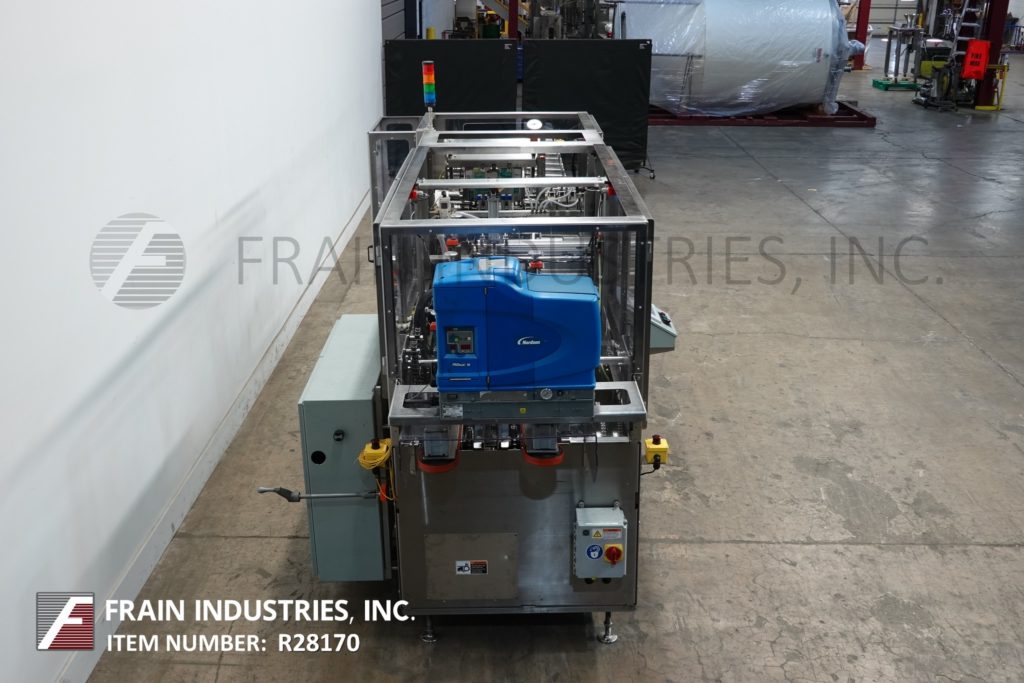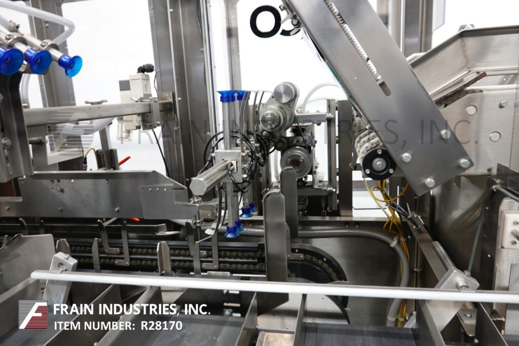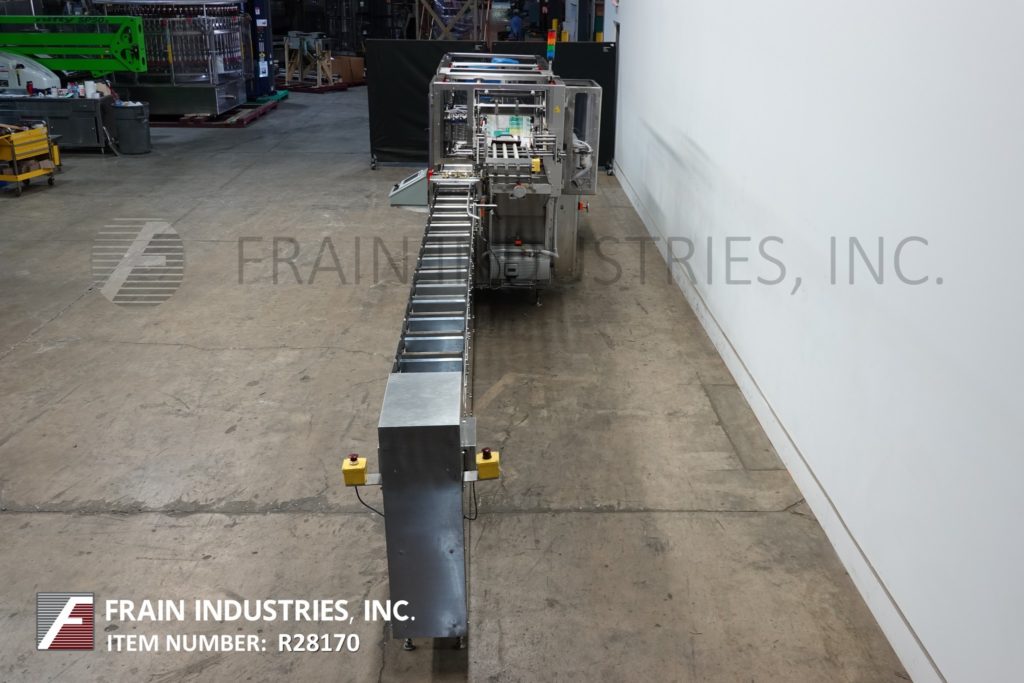 Back to All EquipmentAdco Model 12IAL25SS, automatic, horizontal stainless steel, intermittent, motion, hot melt glue, cartoner with number of cartons per minute – depending on materials and application. Carton size range: 1" to 9-1/2" in Length x 3/4" to 6" in Width x 4" to 12" in Depth with proper change parts. Equipped with (4) chains ajustable set on 12" centers with 1-1/2" wide x 3-1/2" high lugs and 263" long fixed bucket in feed with 7" long x 3" wide x 11-3/4" deep product buckets, 48" long automatic (3) belt blank carton magazine, (2) head rotary pic n place with carton break, top squaring device, single pneumatic push arm product loader, Nordson Problue hot melt glue system, seko gauges, vacuum system and 24" long side belt compression and discharge belt. Control panel has A/B PLC controller and A/B panel view with start, stop, e-stop push button controls and statis light bar. Mounted on stainless steel frame with interlock safety guarding and height adjustable leveling legs.