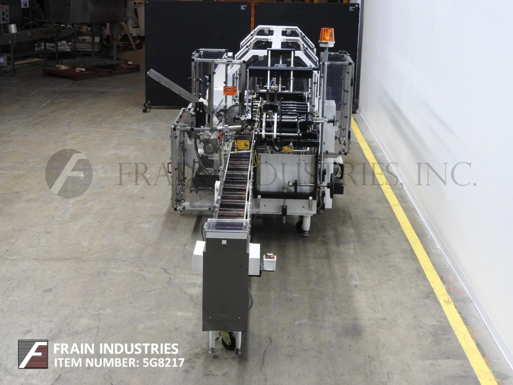 Back to All EquipmentAdco, Model 9JBC10575EC, automatic, continuous motion, horizontal, hot melt glue cartoner, rated from 20 to 120 cartons per minute – depending on materials, application and machine configuration. Carton size range: 1" to 7½" in Length; ¾" to 4" in Width, 4" to 7½" in Depth. Equipped with 3 chains adjustable set on 9" centers with ½" wide x 3½" high lugs, 92" long x 7½" wide in feed conveyor with 1¾" deep adjustable product pockets, 46" long (2) belt powered blank carton magazine, (2) head rotary carton pic-n-place, no-product / no-carton, top carton hold down, barrel cam loader, Nordson hot melt glue system, vacuum pump system and interlock safety guarding. Control Panel has an AB PLC, push button start / stop / reset / E-stop and Rockwell Automation touch screen display. Mounted on heavy duty painted frame with leveling legs.