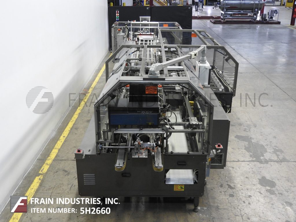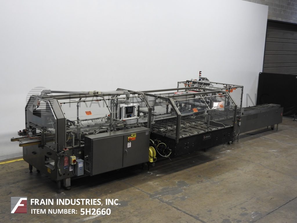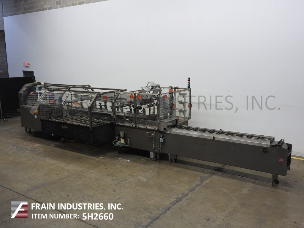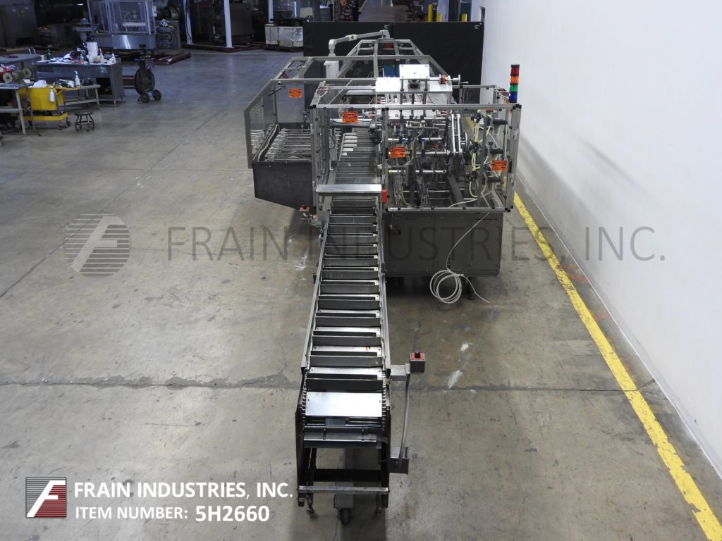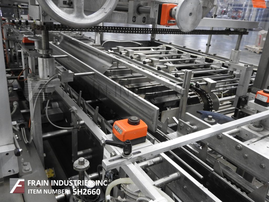 Back to All EquipmentPART OF 5H2660A Adco, Model 9LBC150EC, Automatic, horizontal, continuous motion, hot melt glue cartoner. Rated from 50 to 250 cartons per minute – depending on materials, application and machine configuration. Carton size range: 1" to 7" in Length; 3/4 to 4" in Width, 4-1/4" to 13-1/2" in Depth. Equipped with (4) chains adjustable set on 9" centers with 2" wide x 4" high lugs and has 264" long x 15" wide product in feed conveyor with 2-1/2" long x 2-1/2" wide x 15" deep product buckets, 108" long (4) belt powered blank carton magazine, (4) head rotary pic-n-place, with pre-break, no-product / no-carton, top carton hold down, barrel cam loader, Nordson ProBlue hot melt glue system, major and minor flap closers, 48" long compression discharge belt conveyor section, Seko gauges, vacuum pump, lube system and interlock safety guarding. Control Panel has A/B PLC, with A/B swing arm touch pad controller and panel view with reset / e-stop controls and (4) color stack light. Mounted on heavy duty base frame with caster and leveling legs.