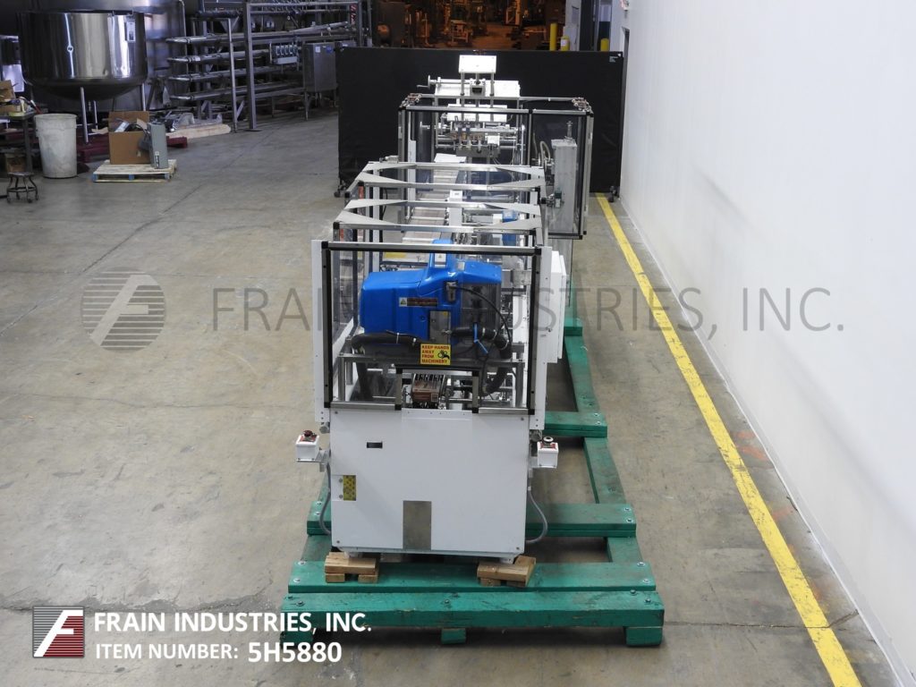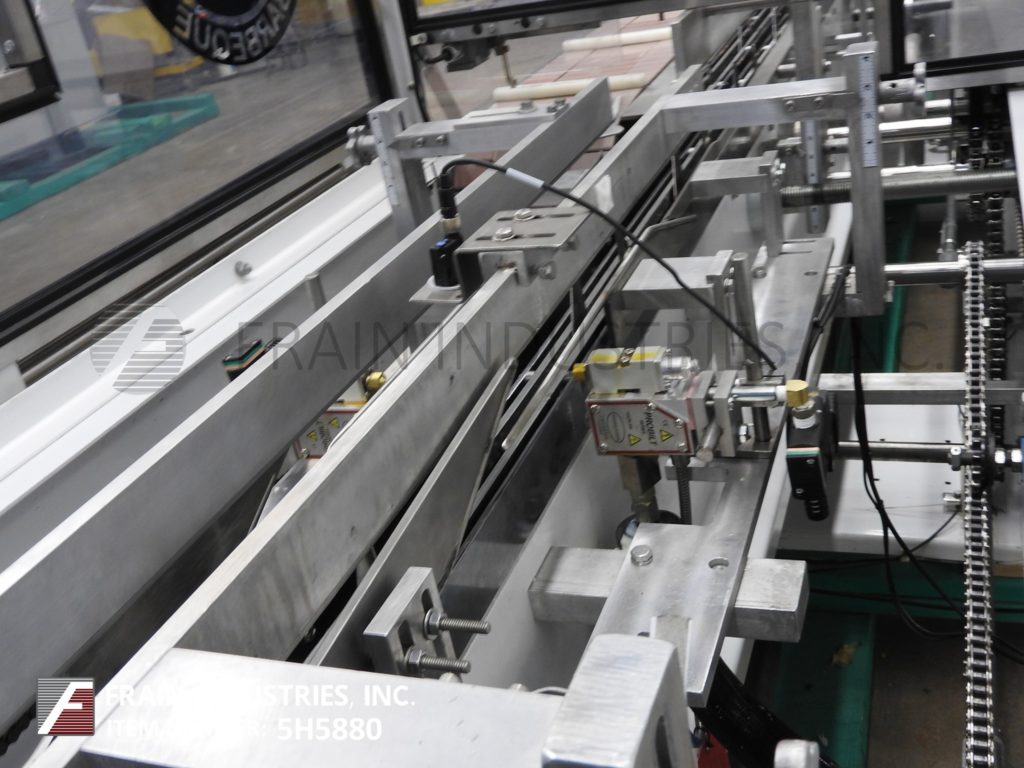 Back to All EquipmentAdco, Model 15D100-ES, Semi automatic, continous motion, horizontal, hot melt glue cartoner. with number cartons per minute – dependant on materials, application, machine configuration and operator dexterity. Carton size range: 1" to 13½" in Length; ¾" to 4" in Width; 4½" to 12" in Depth. Equipped with (4) chains adjutable set on 15" centers with 2" high lugs,183" long x 10" wide product conveyor, 44" long automatic blank carton magazine, (2) head rotary vacuum suction cup pick and place, top carton hold down rail, 54" long operator loading area, Nordson hot melt glue system, carton flap closers, vacuum pump with interlock safety guarding. Control panel has AB CPU, with on / off controls, run, jog, vacuum, hopper, and glue switches with start, stop, e-stop push button controls, and conveyor speed control dial and hand held controller. Mounted on heavy duty frame with casters and height adjustable leveling legs.