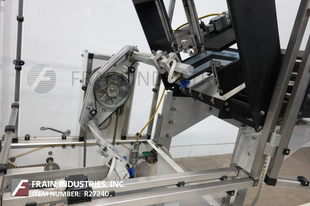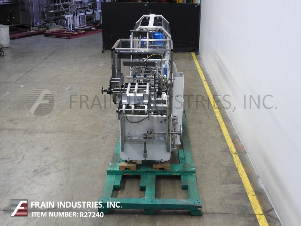 Back to All EquipmentAdco, Model 15D105-EC, semi automatic, horizontal, hot glue cartoner. Carton size range: 1" to 7½" in Length; ¾" to 4" in Width; 4" to 12" in Depth. Equipped with 4 chains adjustable set on 9" centers, with ½" wide x 1½" high lugs, 36" long automatic carton magazine, (2) head rotary vacuum pick and place, top carton hold down rail, 76" long hand product load area, forming plows and flap tuckers, Nordson hot glue system and interlock safety guarding. Control panel with push button start, stop, e-stop controls and on / off switches for glue and vacuum. Mounted on heavy duty frame with safety guarding and casters. Speed dependent on materials, application, machine configuration and operator dexterity.