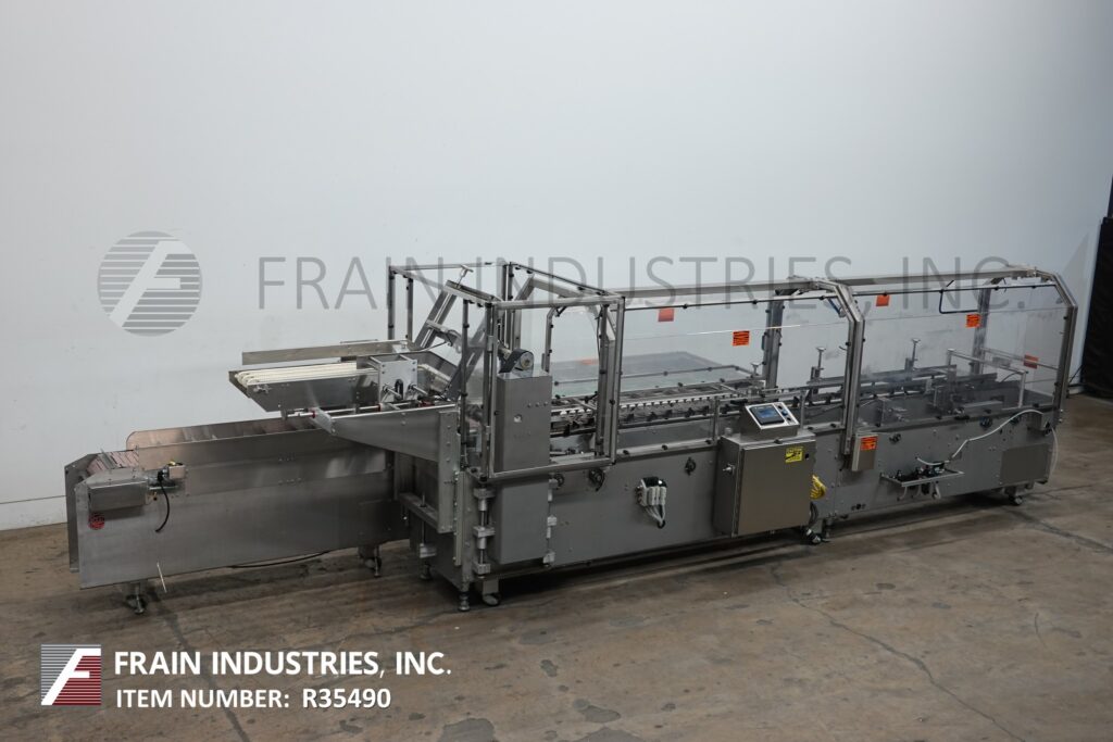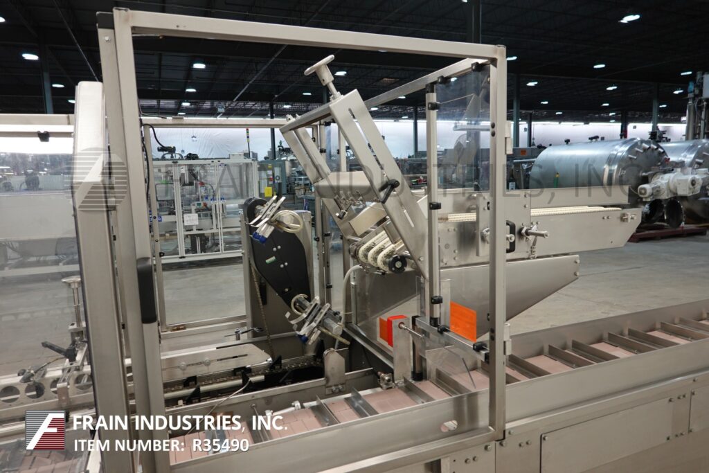Back to All EquipmentAdco, Model 15DBC105-SS, Automatic, stainless steel, horizontal, continuous motion, hot melt glue cartoner rated from 25 to 120 cartons per minute – depending on materials and application. Carton size range: 1" to 9" in Length; 3/4" to 3" in Width 4" to 12" in Depth. All stainless steel construction. Equipped with (4) chains adjustable set on 12" centers with 3" wide x 4" high lugs, 72" long x 12" wide fixed product in feed conveyor with 1-1/2" high cleats set on 5" centers, 48" long (3) belt automatic blank carton magazine, (2) head rotary pic-n-place with pre-break, top squaring device, barrel cam product loader, Nordson hot melt glue system, major and minor flap closers. Control panel has A/B PLC with A/B Panelview touch screen HMI controls. Mounted on stainless steel frame with safety guarding, casters and leveling legs.