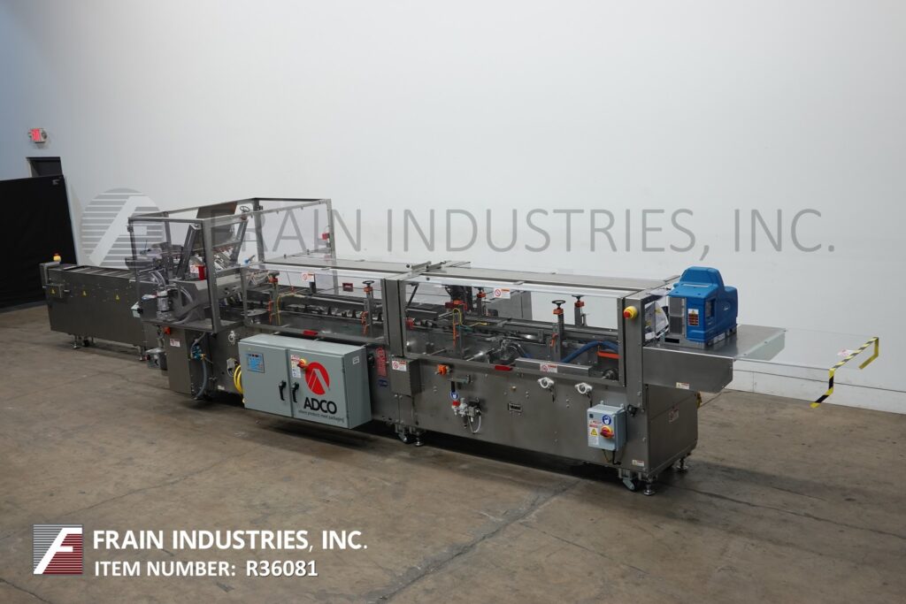 Back to All EquipmentAdco, Model 15DBC105SS, automatic, continuous motion, horizontal, hot melt glue cartoner. Rated from 25 to 125 cartons per minute – depending on materials and application. Carton size range: 1" to 9" in Length; ¾" to 4" in Width 4 to 12" in Depth. Equipped with (4) chains adjustable set on 12" centers and has automatic 36" long (3) belt automatic blank carton magazine, (2) head rotary pic-n-place, with pre-break, no-product / no-carton, no-carton / no load sensing, top carton hold down, barrel cam loader, Nordson ProBlue (2) gun hot melt glue unit and built in vacuum system. Control Panel has A/B PLC controller with start, stop, e-stop push button controls. Mounted on heavy duty height adjustable frame with casters, leveling legs and interlock safety guarding.