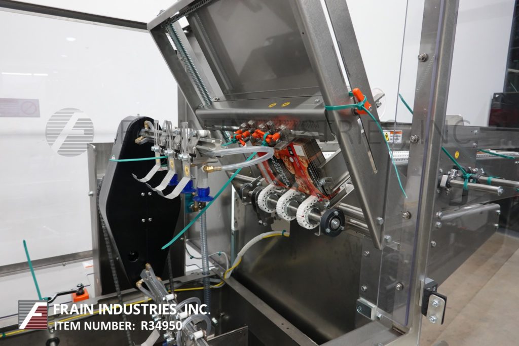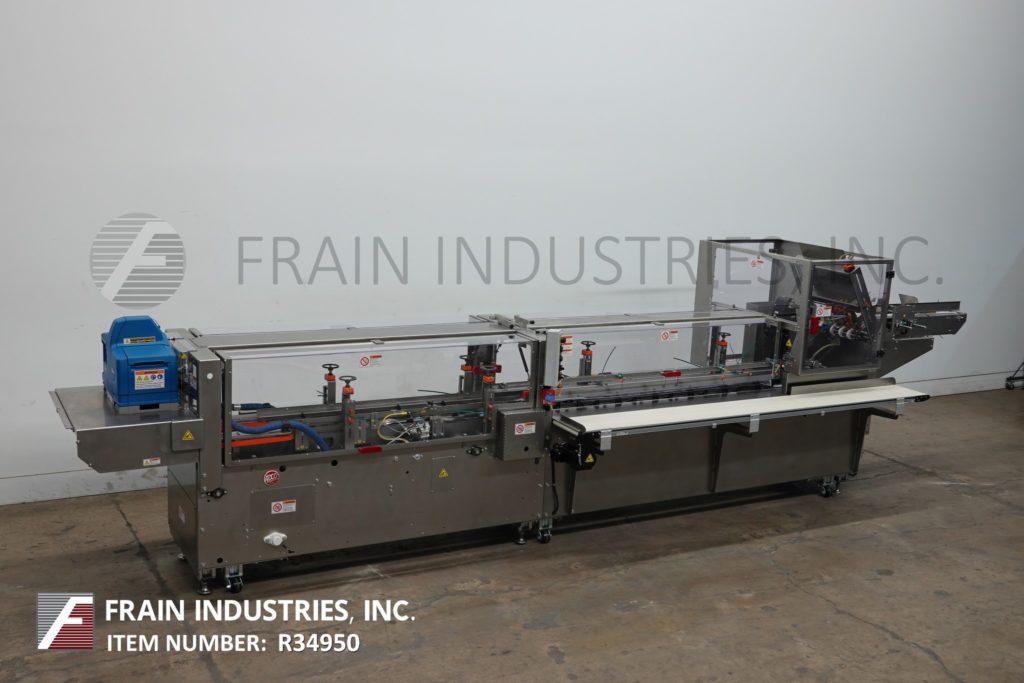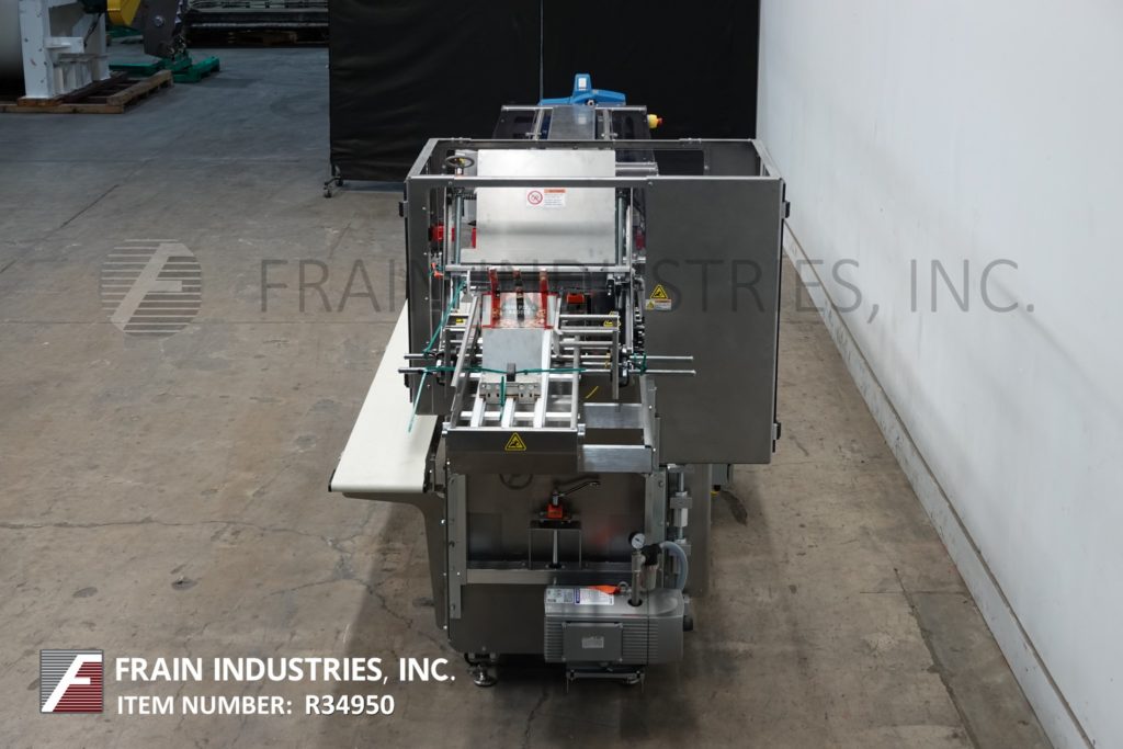 Back to All EquipmentAdco, Model 15D105SS, Semi automatic, stainless steel, horizontal, continuous motion, hot melt glue cartoner rated from 25 to 120 cartons per minute – depending on materials, application, machine configuration and operator dexterity. Carton size range: 1" to 9.5" in Length; 3/4" to 4" in Width; 4" to 12" in Depth. Equipped with (4) chains adjustable set on 12" centers with 2-1/2" wide x 3-1/2" high lugs, 48" long carton magazine, (2) head rotary vacuum pick and place, top carton hold down rail, 119" long x 12" wide product in feed conveyor with 72" long operator hand load area, Nordson ProBlue hot melt glue system, flap closers and 24" long side compression discharge belts, Seco gauges with interlock flip-up safety guarding. Control panel has A/B relay logic controller with A/B VFD controls, start, stop, e-stop push buttons, on / off switches for hot melt glue and oiless vacuum systems. Foot pedal activated carton feed controls. Mounted on stainless steel frame with casters and leveling legs.
