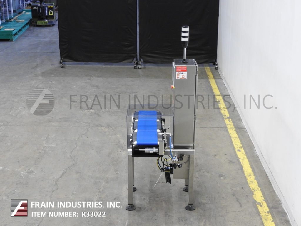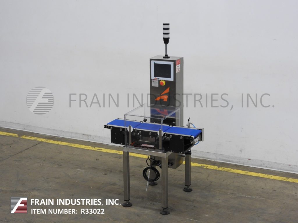 Back to All EquipmentAll Fill, Alpha Model PW12, stainless steel, checkweigher with number of packages per minute – depending on materials and application. Digital strain gage load cell, capable of handling packages up to 12" in Length; 8" in Width and from 5 grams to 3628 grams (8 lbs) with accuracy of +/- 1 grams depending on product. Equipped with 12" long x 8" wide in feed and discharge conveyors and 12" long x 8" wide load cell conveyor with lexan cover over load cell. Control panel with push button operator interface LED display, direct feedback control capability and standard 25 program storage with air reject. Mounted on stainless steel frame with height adjustable legs.