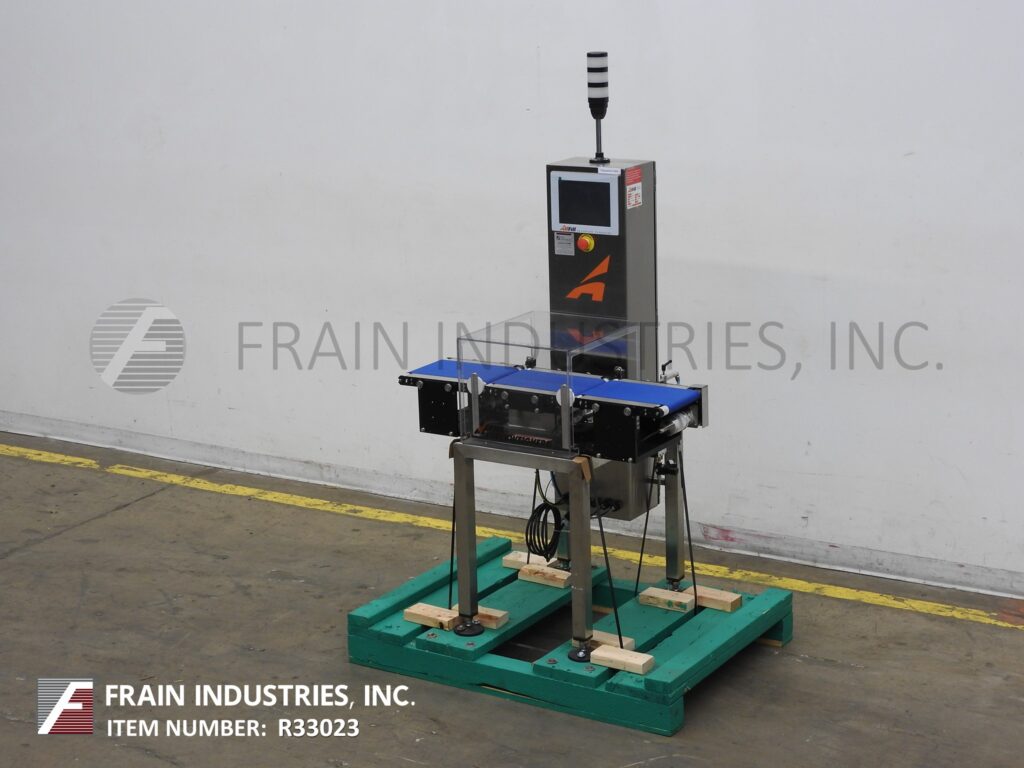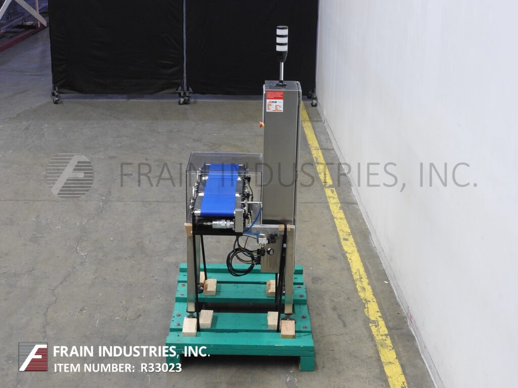Back to All EquipmentAll Fill, Alpha Model PW12, stainless steel, checkweigher with number of packages per minute – depending on materials and application. Digital strain gage load cell, capable of handling packages up to 12" in Length; 8" in Width and from 5 grams to 3628 grams (8 lbs) with accuracy of + / – 1 grams depending on product. Equipped with 12" long x 8" wide in feed and discharge conveyors and 12" long x 8" wide load cell conveyor with lexan cover over load cell. Control panel with push button operator interface LED display, direct feedback control capability and standard 25 program storage with air reject. Mounted on stainless steel frame with height adjustable legs.