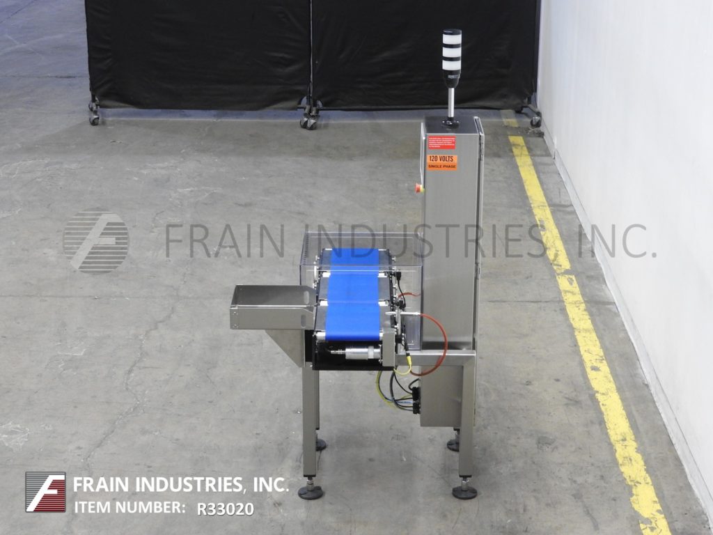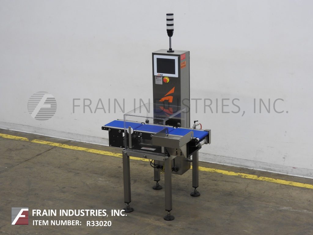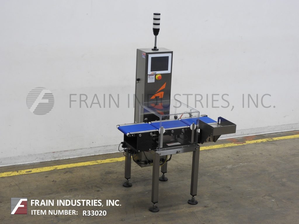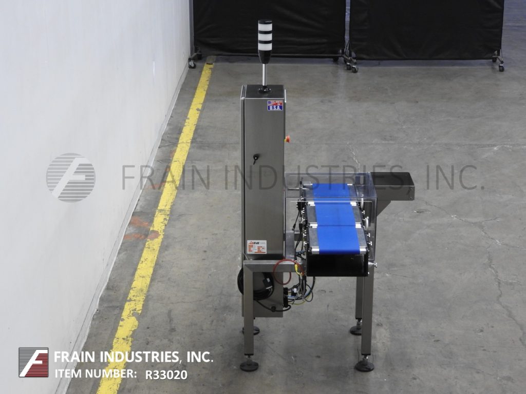Back to All EquipmentAll Fill, Alpha Model PW12, stainless steel, checkweigher with number of packages per minute – depending on materials and application. Digital strain gage load cell, capable of handling packages up to 12" in Length; 8" in Width and from 5 grams to 3628 grams (8 lbs) with accuracy of +/- 1 grams depending on product. Equipped with 12" long x 8" wide in feed and discharge conveyors and 12" long x 8" wide load cell conveyor with lexan cover over load cell. Control panel with push button operator interface LED display, direct feedback control capability and standard 25 program storage with air reject. Mounted on stainless steel frame with height adjustable legs.