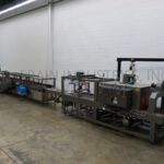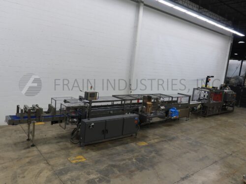 Back to All EquipmentArpac Models TS2212 / TS60 / 45TW-28, Complete, automatic, continous motion, servo driven, tray forming, packing, upstacking and shrink bundling line rated from 5 to 45 trays per minute with number of product per tray – depending on materials and application. Tray Size per application. System consists of Arpac Model 2212 tray former, packer and hot melt glue sealer with 120" long x 18" wide product in feed conveyor with (4) lane dividers to (4) 48" long x 2-1/2" wide product grouping conveyors side mounted 68" wide x 32" high blank tray magazine with (2) suction cup pic n place to tray forming, packing and sealing section with (4)106" long x 1/2" wide lugged compression and discharge conveyor belt section set on 12" centers with Nordson hot melt glue unit with major and minor flap closers.