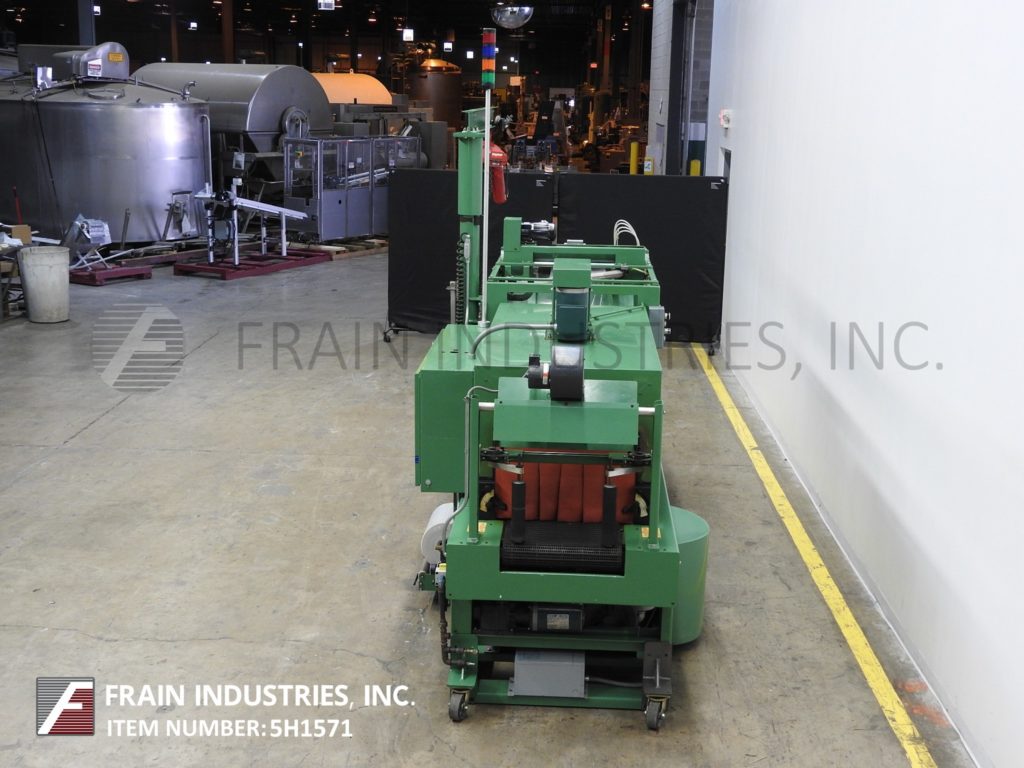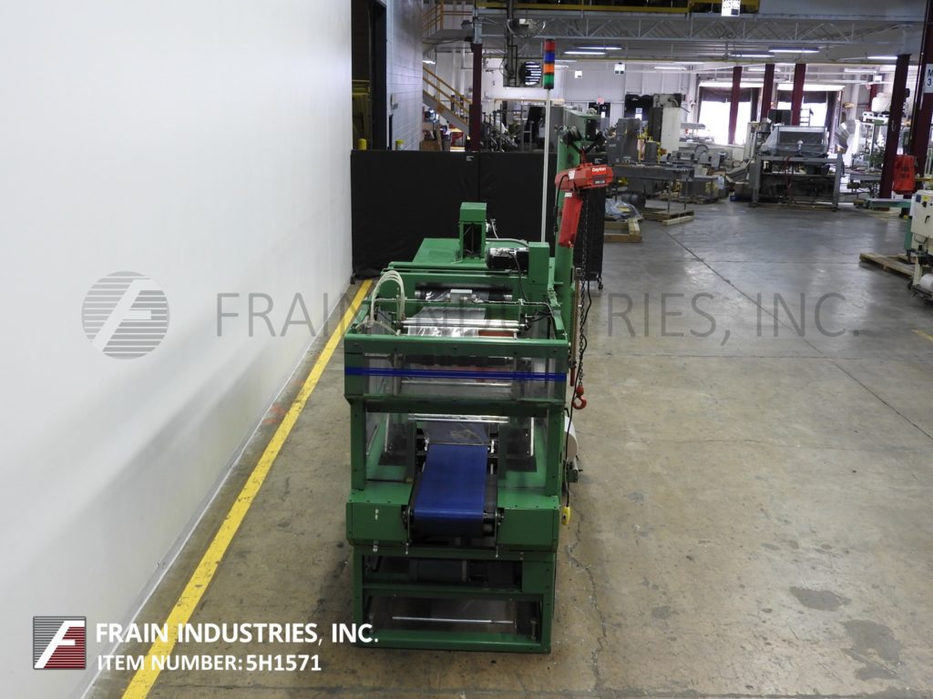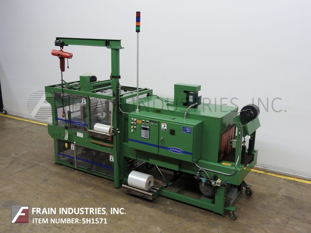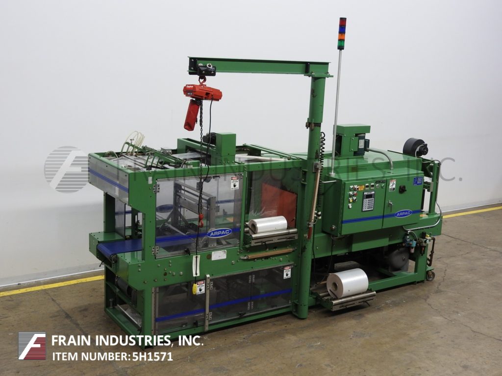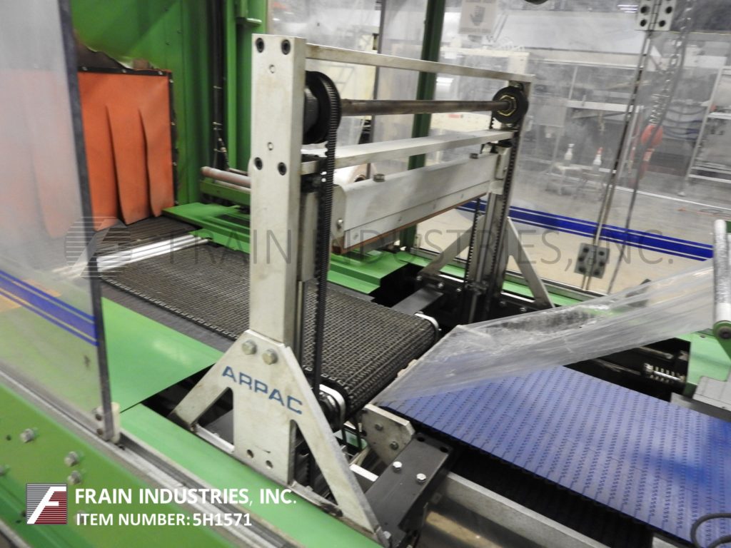 Back to All EquipmentArpac, Model 55GI-20CX, Inline, continuous motion, shrink bundler. Rated from 10 to 55 bundles per minute – depending on materials, application and machine configuration. Equipped with 13" wide x 36" long in feed conveyor, (2) 21" wide film roll holders with film splicing stations, film hoist, 21" wide walking beam seal jaws with 11" vertical travel and 13" wide x 28" long transfer conveyor to shrink tunnel. 70" long single zone shrink tunnel has 21” wide x 16" high total aperture, 90" long x 20½" wide product conveyor, cooling fan and roller side compression on discharge. Control panel with AB controller, touch pad controls with readout, start / stop / e-stop / manual seal push button controls and digital temperature controls for seal bar and tunnel. Mounted on heavy duty base frame.