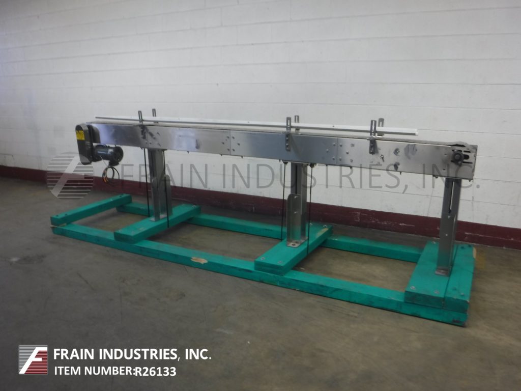 Back to All EquipmentStainless Steel, 6" wide x 138" long, delrin table top conveyor. Equipped with a 35" infeed/discharge height. Powered by a ½ Hp 90v DC drive.
