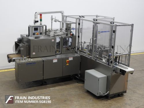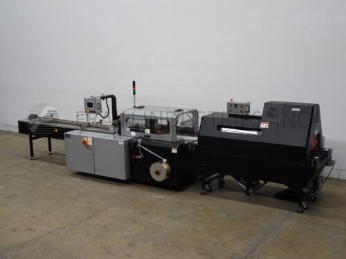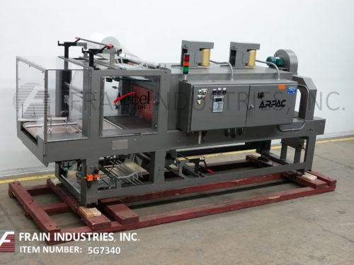 Back to All EquipmentArpac, Model BPTW-6000, Automatic, inline, continuous motion, registered film, shrink bundler and tunnel. Rated 10 to 60 bundles per minute – dependent on materials, application and machine configuration. Product size range: 8" to 12" in Length; 6" to 20" in Width; 3" to 12 in Height. Film specs: to 26" in Width; to 20" in Diameter; on 3" core; can handle clear or printed film of 1.75 to 2.5 mil low density polyethylene and has maximum film cut-off length of 42". Equipped with dual side mounted film racks, splicing bar, infeed spacing conveyor, film registration, 28" seal bar and bottom overlap seal, with 20" film diameter " on 3" OD core, with (3) zone shrink tunnel has adjustable flow vents, variable speed blowers and cooling fans on discharge. Control panel has A/B controller with touch screen HMI and statis light bar. Mounted on heavy duty formed and structural steel frame with safety guarding.