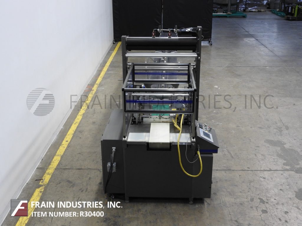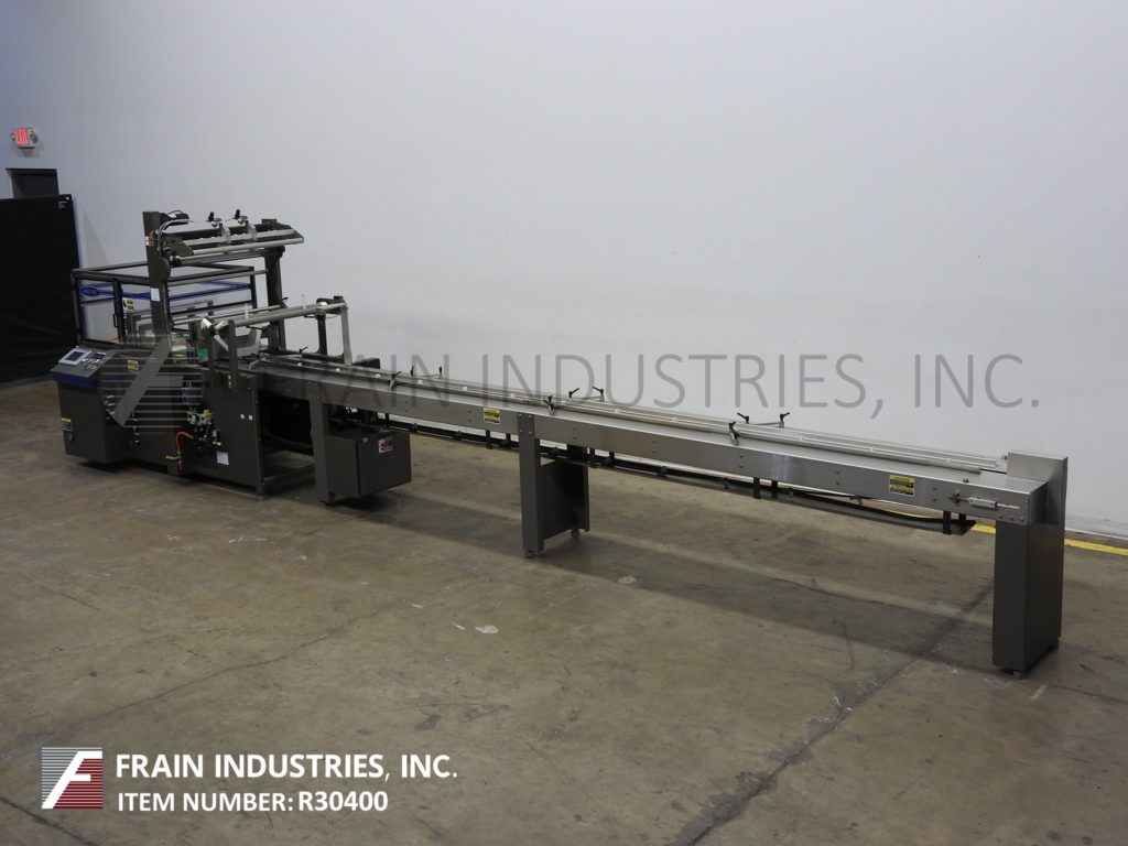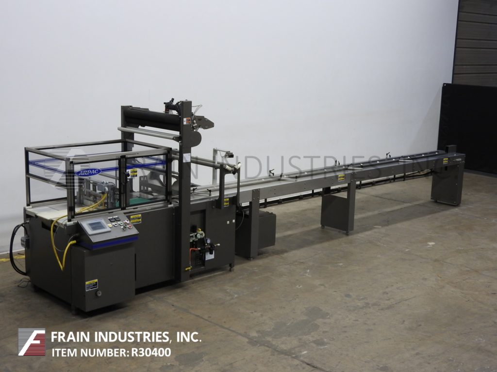Back to All EquipmentArpac Model HC37, horizontal, continuous motion, servo driven, flow thru shrink wrapper and bottom lap sealer rated from 0 to 90 linear feet and 0 to 80 packages per minute – depending on materials, application and product stability. Product size range: 3-1/2" to per application in Length; up to 16" in Width; up to 7-1/2" horizontal jaws and up to 12" vertical jaws in Height. Equipped with 245" long Lugged servo driven in feed conveyor with 1/2" wide x 1" high lugs set on 16" centers with adjustable guide rails into the flow wrapper forming plow, with 19" long 9-1/2" wide vacuum conveyor pulling film and product to 32" long x 9-1/2" wide neophreme belt conveyor thru the 17" wide interchangeable horizontal or vertical cross seal jaws and overlapping bottom film static lap seal to the discharge. Centerfold film maximum width up to 37" and film roll maximum OD up to 14" and has 38" long servo driven film rolls with perf wheels. Control panel has A/B CPU and A/B panelview controller with seal bar and lap seal temperature controllers, manual / jog, cycle start and on / off with e-start, Mounted on (4) leg base frame with interlock safety door guarding.