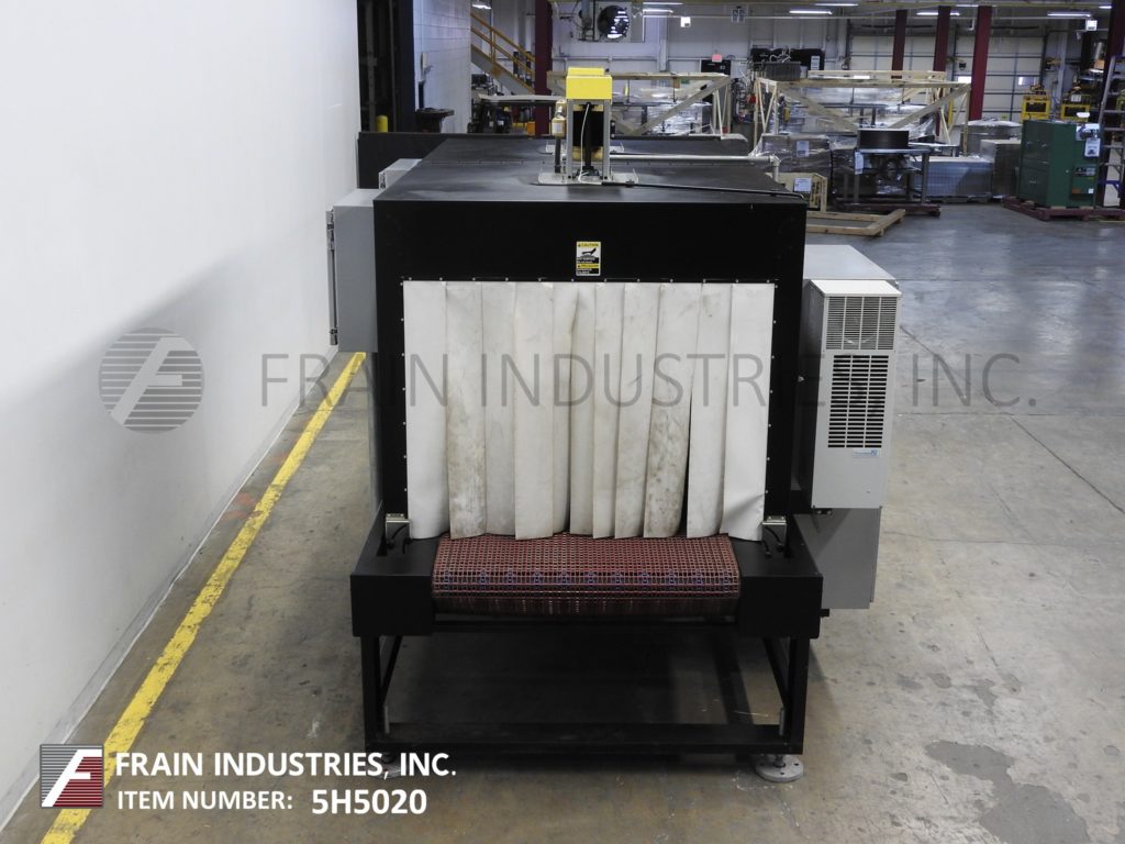 Back to All EquipmentArpac Model T54-40-120, high speed, (2) zone shrink tunnel with number of product per minute – depending on materials and application. Tunnel has total aperature of 40" in Height; 54" in Width. Chamber dimensions of 120" in Length. Equipped with 150" long x 45" wide nylon fiberglass flexlink product belt conveyor with 38" in feed and discharge heights. Top mounted dual blowers independently controlled to accommodate high speed shrink wrapping systems. Control panel has heater 1 and 2 controls, power on, cycle start, stop, cycle, reset e-stop buttons. Mounted on heavy duty frame with (4) height adjustable legs.