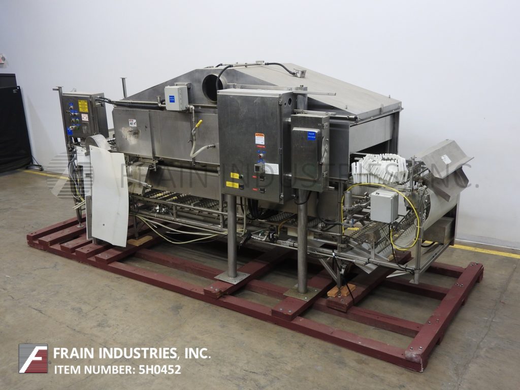 Back to All EquipmentAutomated Food Systems, Stainless steel, intermittent motion, electric corndog fryer. Rated from 1,000 to 8,000 corndogs per hour – depending on materials, application and machine configuration. Equipped with fixed bucket in feed conveyors for the hotdogs, (18) lane inserter with product hold down, 15" long x 33" wide batter tray, 120" long x 33" wide electrically heated two zone hooded fryer bed with a 15" diameter exhaust port and reciprocating product removal with 13" long discharge chute. Control panel with an AB controller, push button start / stop / jog, (2) digital temperature controls and heater on / off switch. Mounted on heavy duty multi leg base frame.