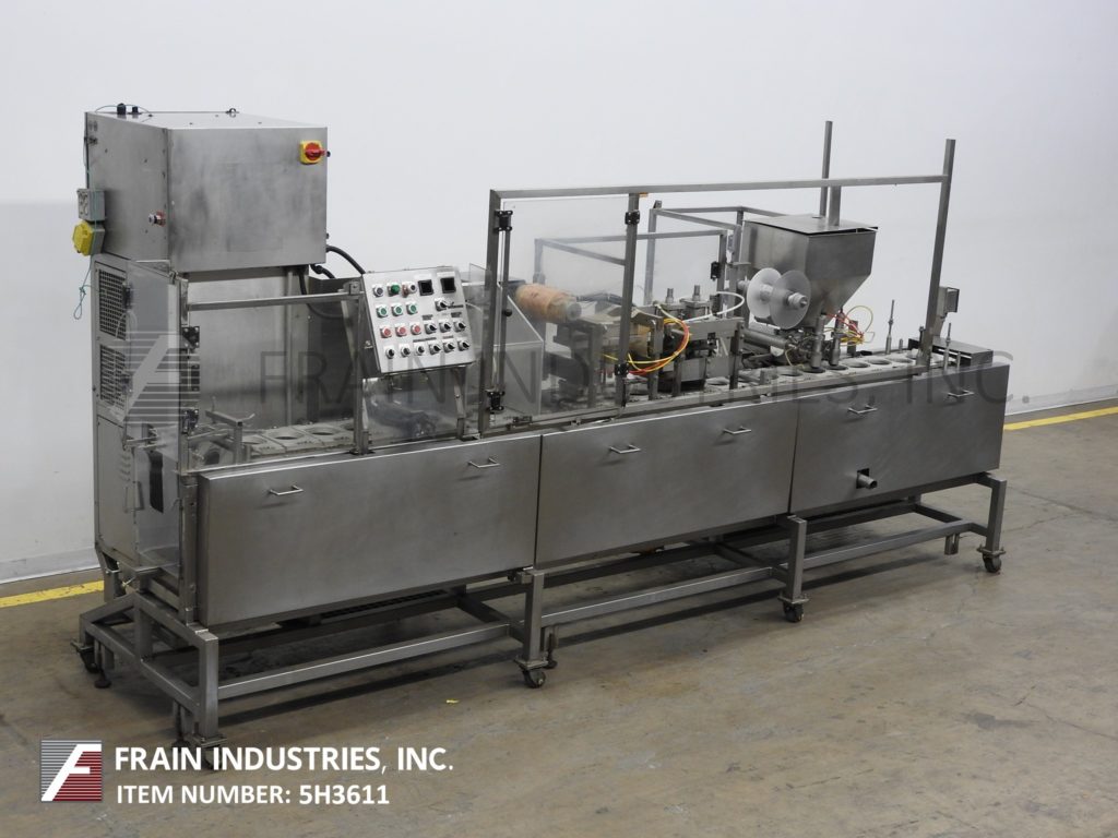Back to All EquipmentAutoprod / Oystar Model FP2x1, Automatic, stainless steel, single lane, (2) up, cup filler roll stock film and heat selar rated from 10 to 60 containers per minute – depending on materials, application and machine configuration. Container size range: up to 5" in diameter and 5" in height. Equipped with cup denester, 18" wide x 16" long x 18" deep product hopper, (2) 32 ounce piston with rotary valve and positive cut off nozzles, roll stock film with heat seal station and re-wind with reciprocating pick and place overlidder. Control panel has push button and switches,with digital temperature controls. Mounted on heavy duty stainless steel frame with safety guarding.