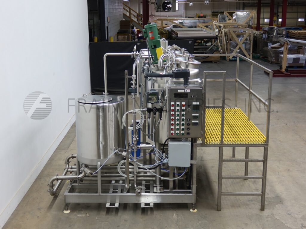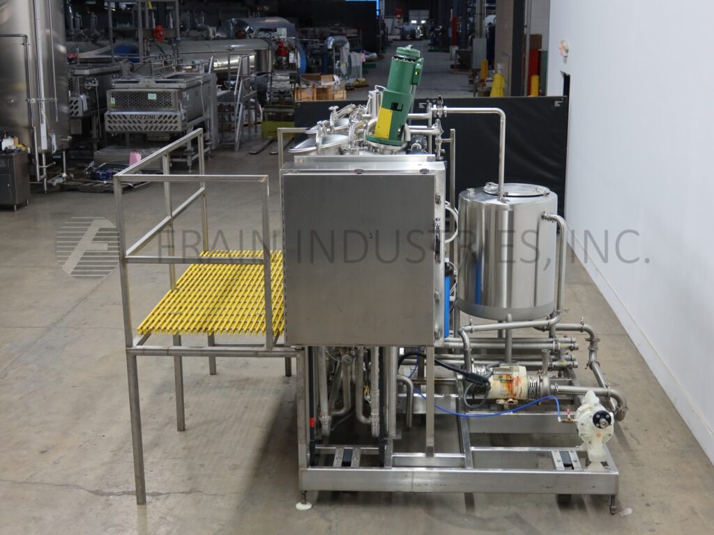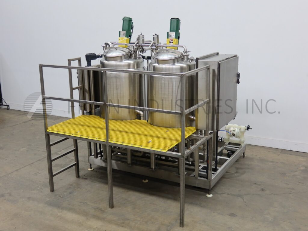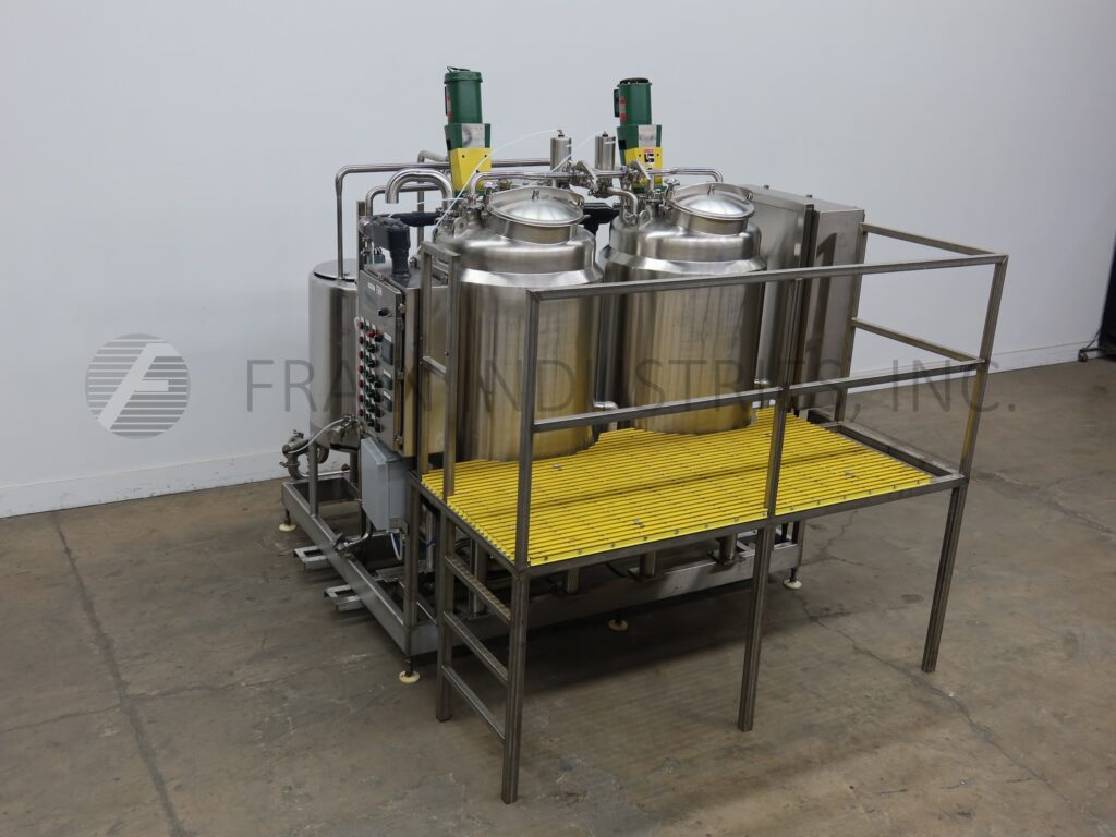 Back to All EquipmentAvins Fabrication skid mounted blending system. Equipped with (2) 125 gallon jacketed tanks. Vessel dimensions: 30" diameter x 42" deep with a 38" straight wall; each 125 gallon tank equipped with a 16" manway and 0.30 HP prop agitation. (1) 100 gallon single wall tank. Vessel dimensions: 30" diameter x 36" deep. (2) APV W+35/35 centrifugal pumps and (1) Wilden P200 air diaphragm pump.