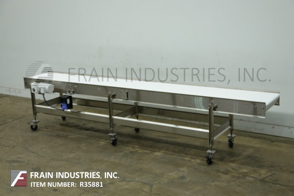 Back to All EquipmentBMI stainless steel frame conveyor. Equipped with 24" wide x 180" long table top product conveyor belt and has 34" to 39" in feed and discharge height range. Mounted on stainless steel leg frame with leveling pads.