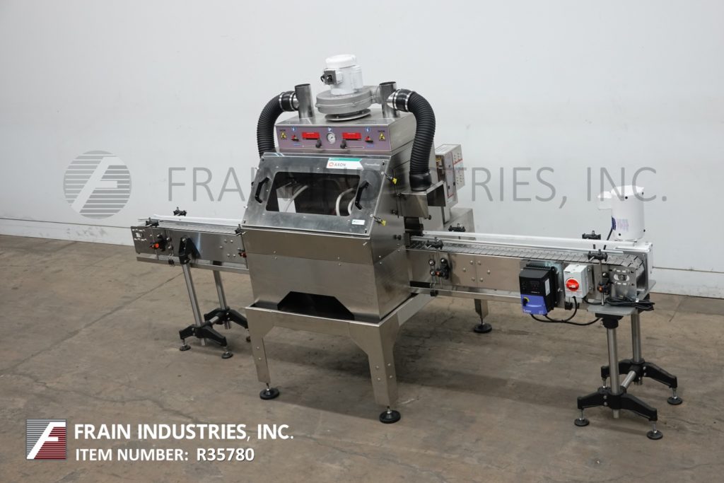 Back to All EquipmentAxon, Model Thermoflow, Stainless steel, steam shrink tunnel and conveyor with number of product per minute – depending on materials and application Capable of handling round, square, oval and other irregularly shaped containers. Container size range 1" to 6" diameter x 2" to 12" tall. Equipped with 30Kw steam generator, 6½" wide x 13" high aperture x 36" long tunnel, with (3) sets of steam nozzles and 6" wide x 140" long stainless steel conveyor. Mounted on stainless steel frame.