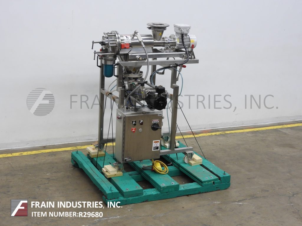 Back to All EquipmentAzo Model DMZC-AL-150, continuous, portable, stainless steel, centrifugal sifter with pounds of product per hour – depending on materials and application. Equipped with 18" in Length x 8" OD sifting chamber with 11" OD, 6¾" ID top product hopper flange with (8) 1-7/8" bolt holes on 4½" centers, top and front hinged bolt down acces doors with interlock safety switches, bottom 6½" OD , 6" ID bolted flange for dust collection, 19" in Length x 4" OD removeable hygenic sifting screen and scrape paddle. End bottom 6" ID discharge chute with 27" ground clearance. Control panel has on / off switch with high frequecy controller with 1 Hp motor drive. Mounted on a 4 leg stand with casters.