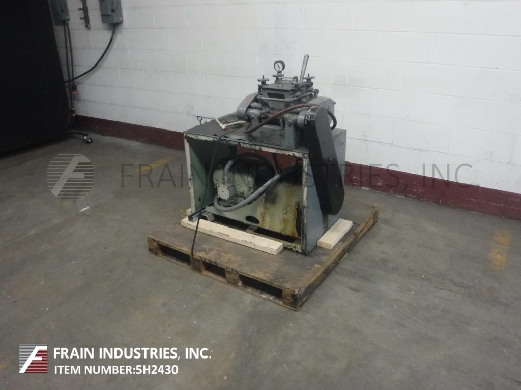 Back to All EquipmentBaker Perkins, Model 0.1 ft³ (¾ gallon) working capacity, jacketed, carbon steel, double arm, sigma blade mixer with pounds of product per hour – depending on materials and application. Inner mixing chamber dimensions: 5½" in Length; 7¼" in Width; 7" in Depth. Equipped with carbon steel contact parts, bolt down cover with pressure guage, 2 Hp motor drive, hand tilt with 30" discharge height and (3/8)" NPT connections for low pressure jacket. Mounted on a painted steel base frame with push button start / stop controls.