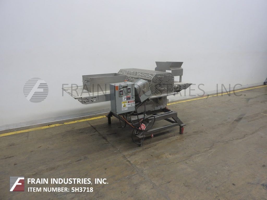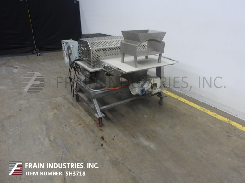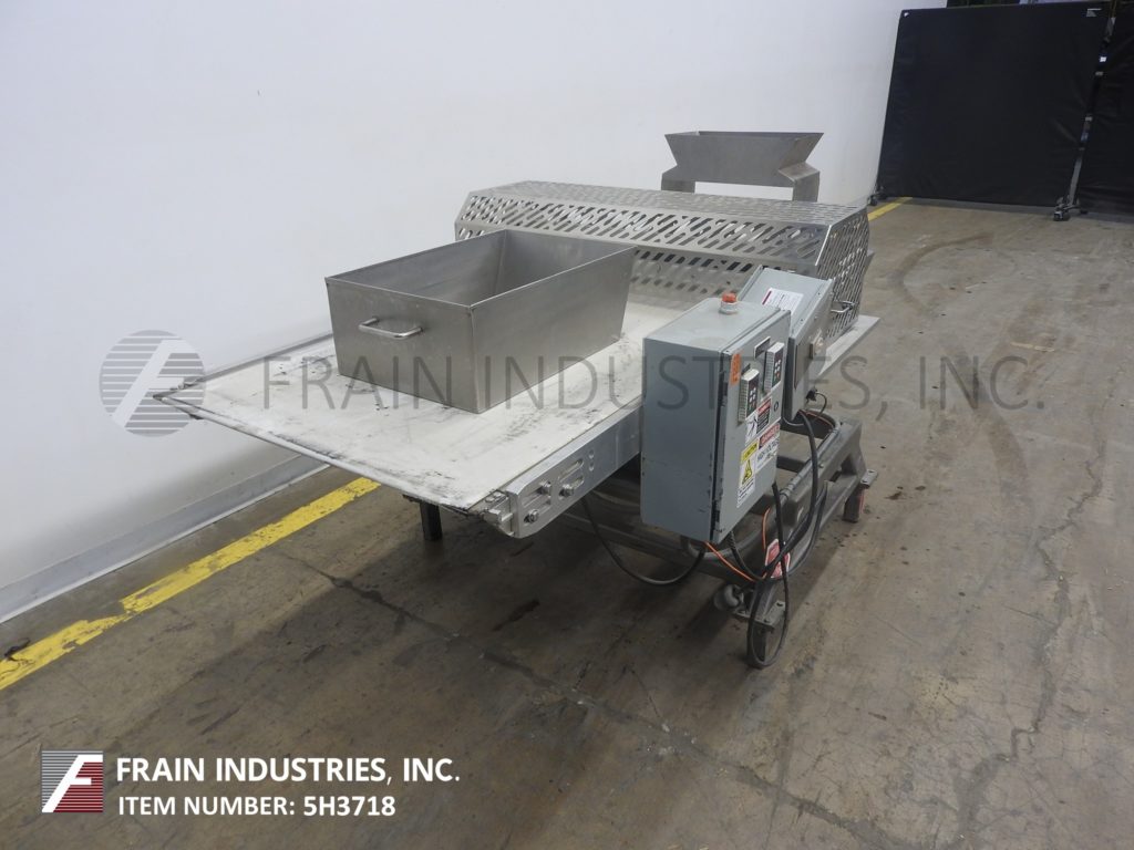 Back to All EquipmentStainless steel conveyor mounted guillotine. Equipped with a 32" Wide x 85" Long canvas conveyor powred by a 1 hp drive with a 35" to 40" in feed and discharge range and 32" Wide mechanical cutting knife blade powered by a ¾ hp drive with cage style safety guarding. Control panel with variable speed controls for conveyor and knife. Mounted on a painted frame with leveling pads.