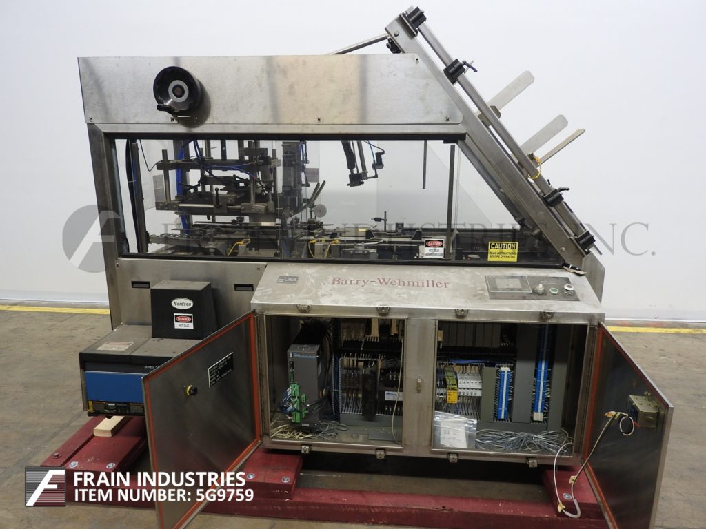 Back to All EquipmentBarry Wehmiller, Model 3000NSC, automatic, stainless steel wrap around case packer. Rated from 1 to 8 cases per minute – depending on materials, application, pack pattern and machine configuration. Case size: 3" to 12" long x 3" to 12" wide x 4½" to 13" deep. Equipped with 18" long case magazine, (2) vacuum suction cup pick and place, lugged holder case conveying system, Nordson hot melt glue system and safety guarding. Control panel has an AB controller and touch screen controls. Mounted on heavy duty base frame.