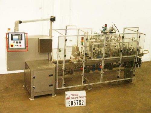 Back to All EquipmentBartelt Model IM712, Automatic, horizontal, mechanical driven, intermittent motion, form, fill, seal machine with single head auger filler rated from 12 to 80 pouches per minute – depending on materials and application. Pouch size range: 2" to 5-3/4" in Width; 2" to 9-1/2" in Length. Equipped with chain feed pouch conveyor and has 12 stations set on 7" centers, forming plow, with tension rollers, pouch side seal and cut-off stations, suction cup pouch opener, single head auger filler with controller, spinning wheel top pouch dust-off and heat seal bar with pouch pick-off station. 18" OD maximum film roll, with 20" maximum web width, on 1" OD core. Control panel has PLS controls with auger, start, run, jog, registration, top, bottom and side heat seal control switches with start, stop e-stop and web feed push button controls. Mounted on heavy duty frame with cage style safety guarding.