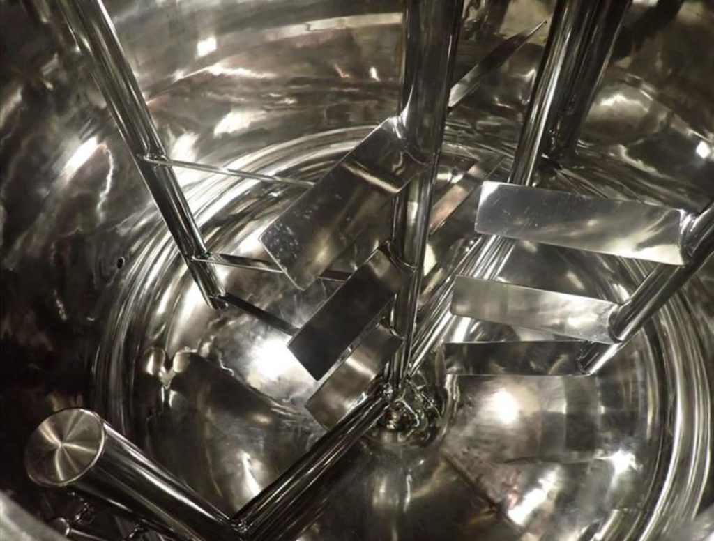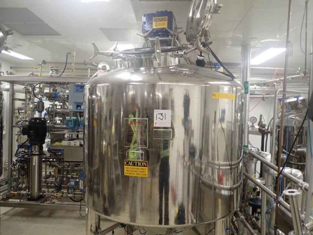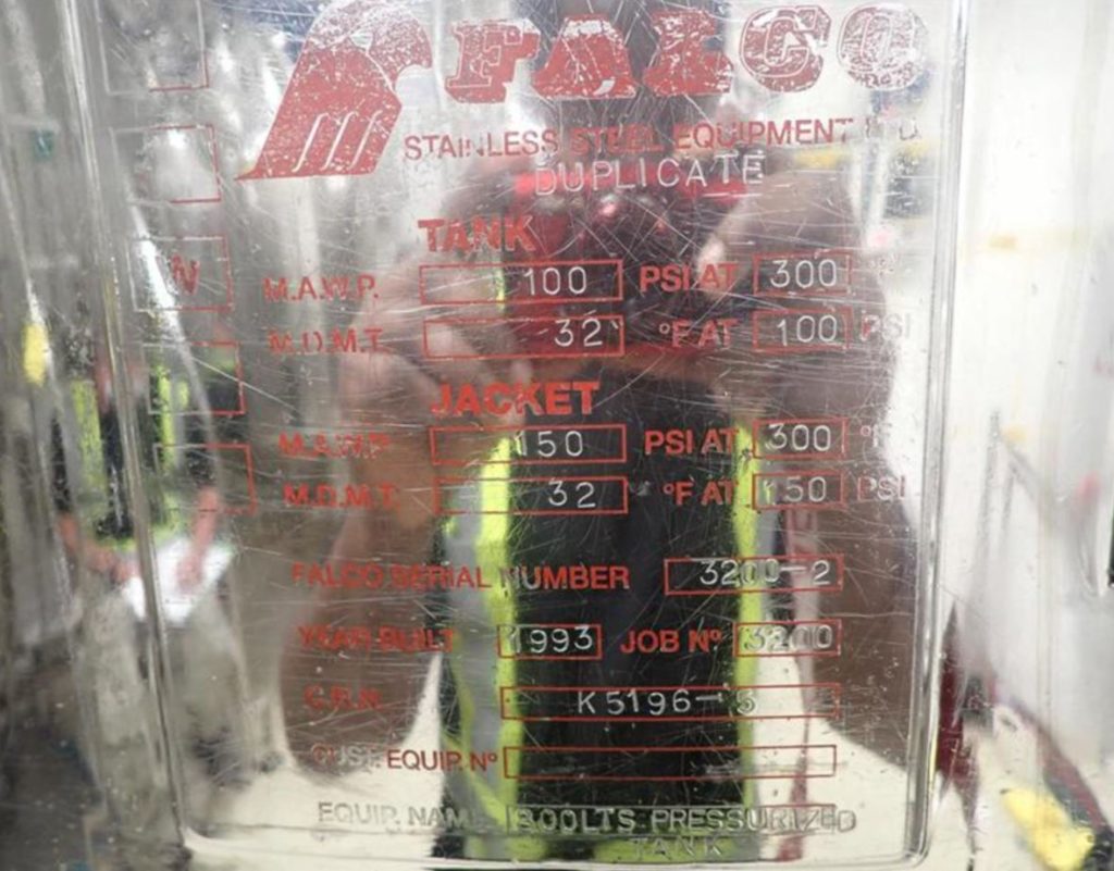 Back to All EquipmentFalco Stainless Steel Equipment Co, 800 litres, 200 gallon, stainless steel jacketed process reactor tank. 316L exterior with # 7 finish and 316L electro polished finish. Vessel dimensions: 55" OD x 66" deep with 36" straight wall and 26" cone bottom. Equipped with dome top and has 16" OD manway with flip up, bolt down cover, top mounted 5 Hp motor drive for scrape surface agitator, (2) Thermowells and 2" OD / 1" ID flush bottom center bottom discharge valve with 16" ground clearance. Mounted on stainless steel (3) leg frame.