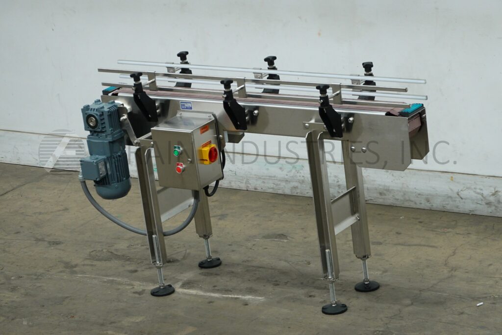 Back to All EquipmentBMI stainless steel frame belt conveyor. Equipped with variable speed controler, 4½" wide x 56" long stainless steel table top product conveyor belt, adjustable guide rails and has 31" to 37" in feed and discharge height range. Mounted on (4) leg stainless steel leg frame with leveling pads.