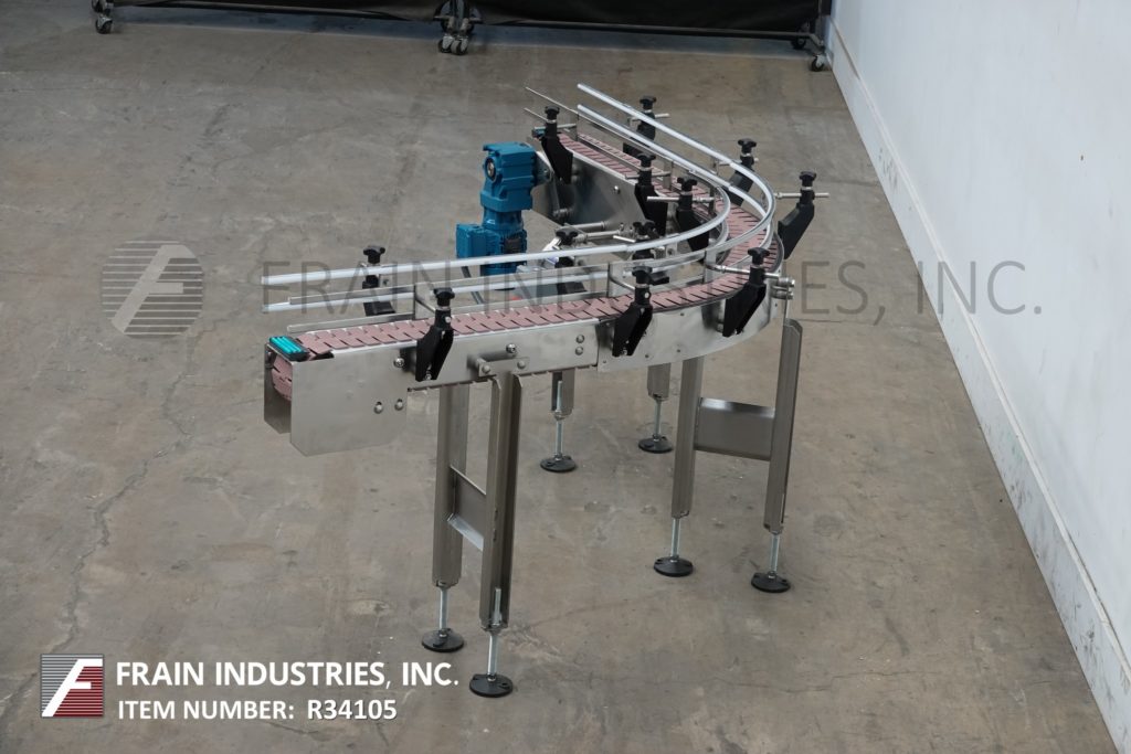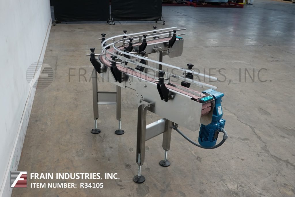 Back to All EquipmentBMI, 90° 4½" wide x 105" long, stainless steel conveyor. Equipped with a 48" long infeed to 90° turn to a 48" long discharge with a 30" to 37" infeed / discharge height. Powered by a ½ hp drive.