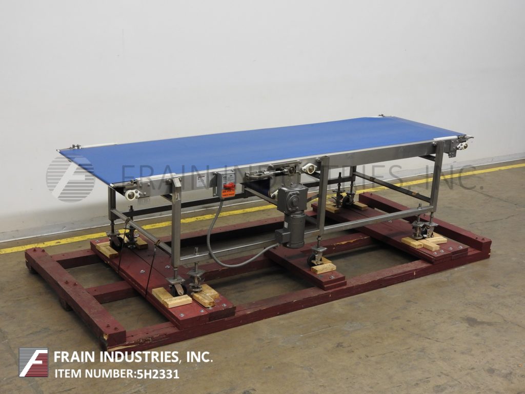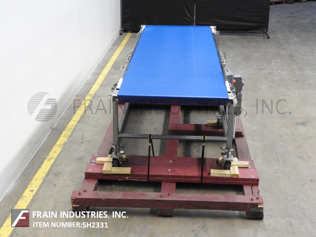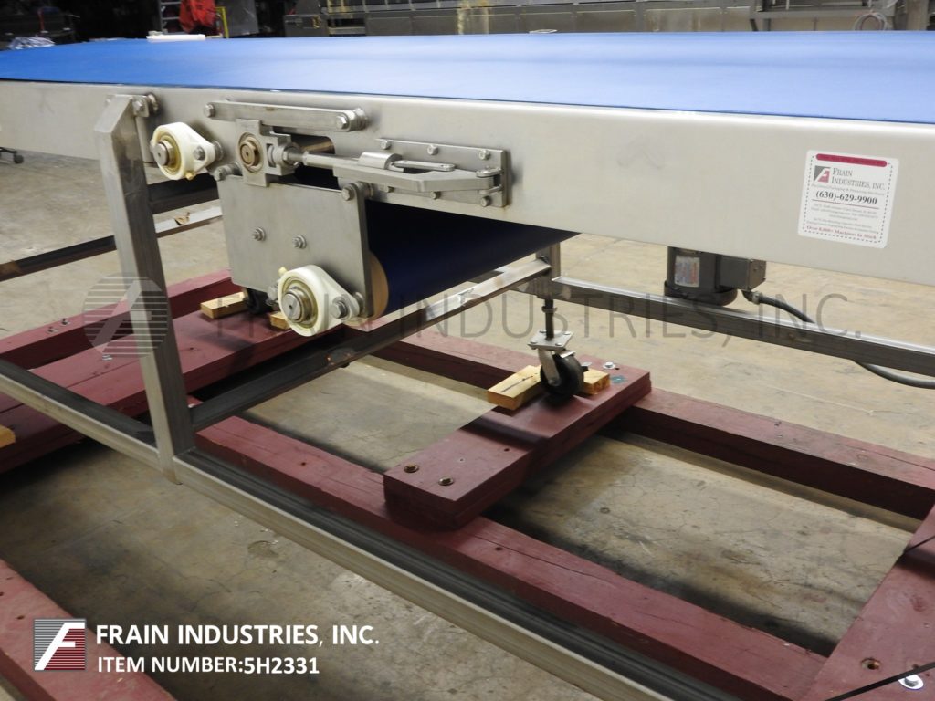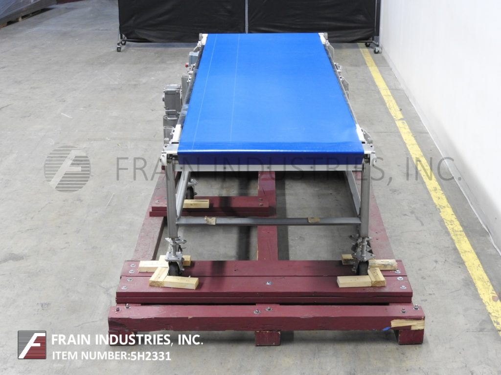 Back to All EquipmentBMI, Model 5030, 39¼" wide x 145" long, stainless steel belt conveyor. Equipped with a 39¼" wide x 145" long blue food grade belt, 1 Hp drive and mounted on (6) legs with locking casters and an infeed / discharge range of 32" to 40".