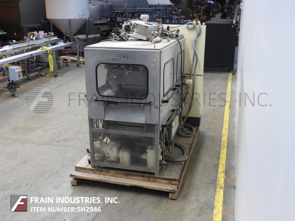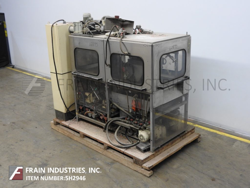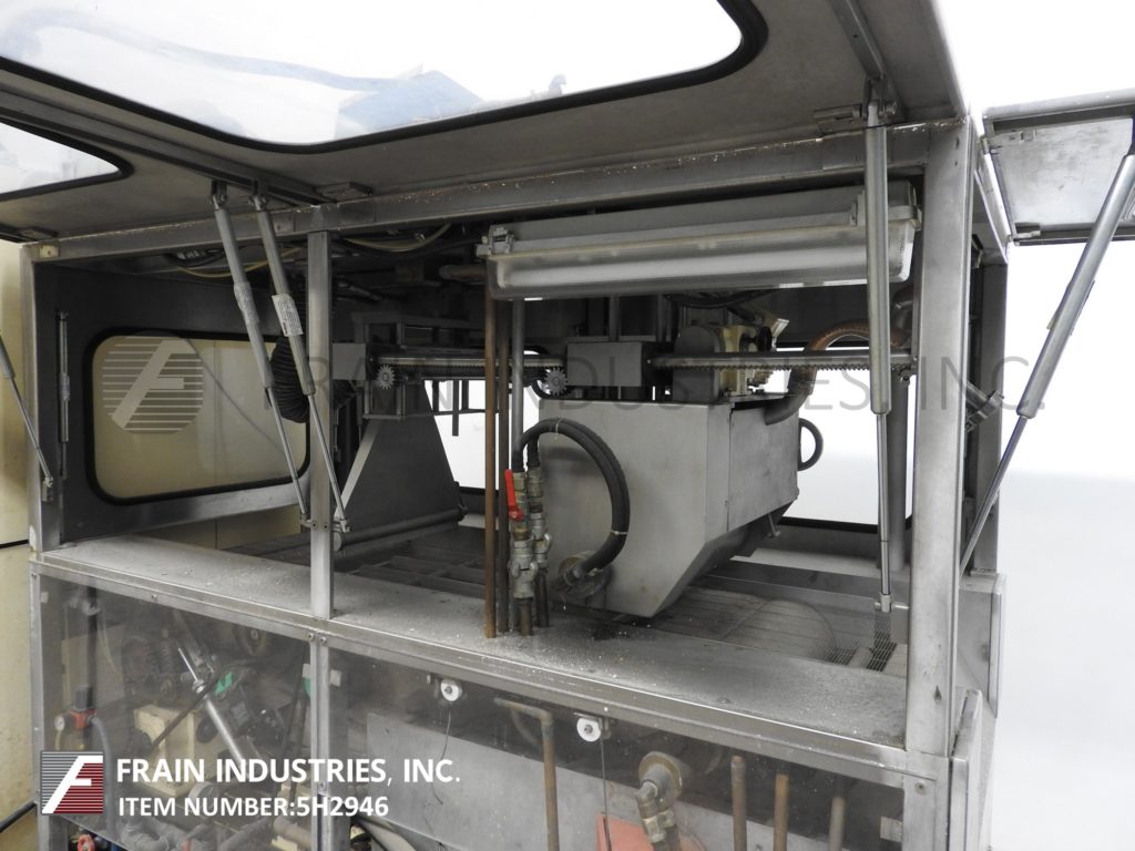 Back to All EquipmentFrisse, Model UZM421, 16" wide, top and bottom chocolate enrober with pounds of product per hour – depending on materials, application and machine configuration. Equipped with a 16½" wide x 71" long stainless steel mesh belt thru the enrober, (1) 16¾" wide bottom roller applicator, (1) 16¾" wide jacketed top roller applicator, blower, detailer, shaker, overhead heaters with sliding and flip-up safety doors. System includes a positive displacement chocolate circulation pump and self contained two zone 5000 watt water heating system with (2) water pumps. Control panel with push button on/off controls for: agitation, bottom well, vibration, chocolate recirculation pump, chocolate return pump, curtain agitation, blower and detailing. Control panel also includes (3) temperature controls for: water zone 1, water zone 2 and air temperature.