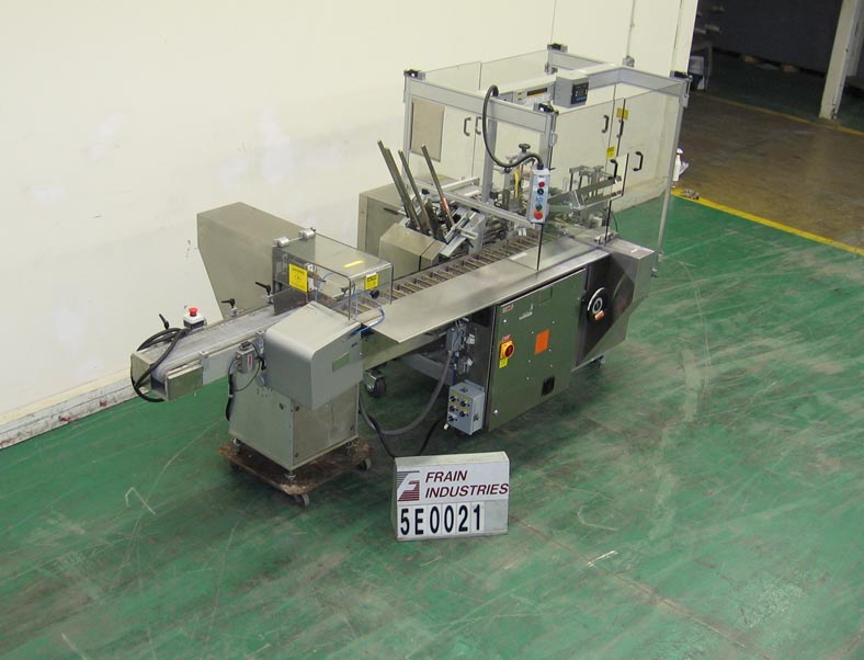 Back to All EquipmentAutomatic, intermittent motion, horizontal, walking beam, tuck cartoner capable of speeds from 30 to 60 cpm – speeds depending on materials and application. Cartons size range: 1/2" – 3 1/2" L x 1/2" – 2" W x 2" – 7 3/4" D, has adjustable bucket in feed, right angle product pusher into carton, dual walking beam drive on 4-3/4" centers, 27" L magazine, reciprocating vacuum pic-n-place, top carton squaring mechanism and e-stop. AB SLC 5/04 with Panel View, integrated vacuum pump, changeover gauges and barrier guarding with electrical interlock, and is mounted on stainless steel frame with casters and height adjustable legs.