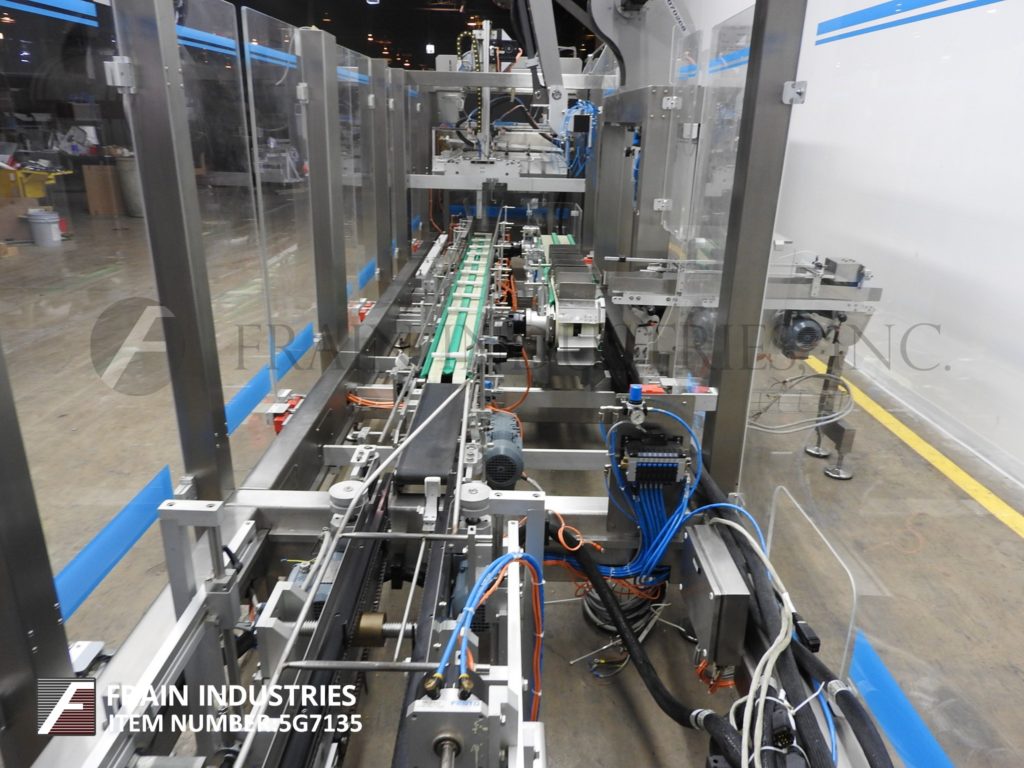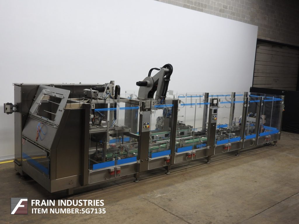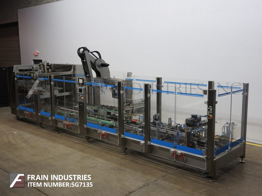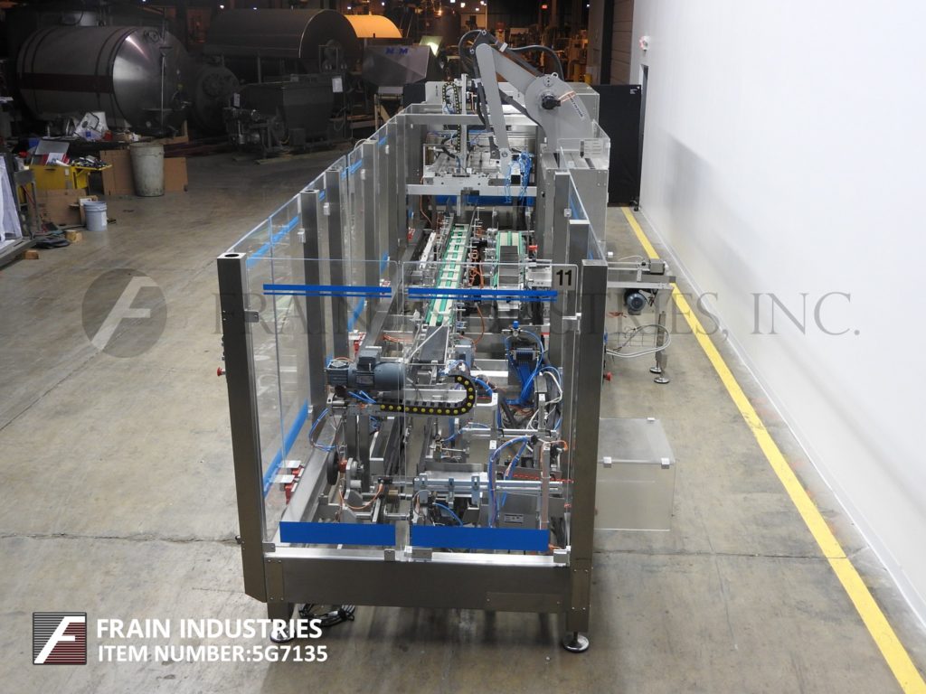 Back to All EquipmentCama, Model IF297, Stainless steel, hooded tray former, robotic loader and tri-sealer, with number of trays and product per minute – depending on materials, application, pack pattern and robotic stroke. Product and case size range per application Equipped with blank tray magazine, (4) suction cup pic n place, single ram tray forming head, with hot melt glue system, 150" long lugged tray conveyor set on 14" centers, 84" long product conveyor with (8) 6" long x 3-1/2" wide x 8" deep fixed product pockets, single head, 2-axis robotic product pic n place loading arm, 90" long transfer conveyor thru the hot melt tri-sealing glue system. Control panel has A/B controller with Panelview and touch screen interface, Seko gauges and interlock micro switch safety guarding. Mounted on (12) leg height adjustable base frame.
